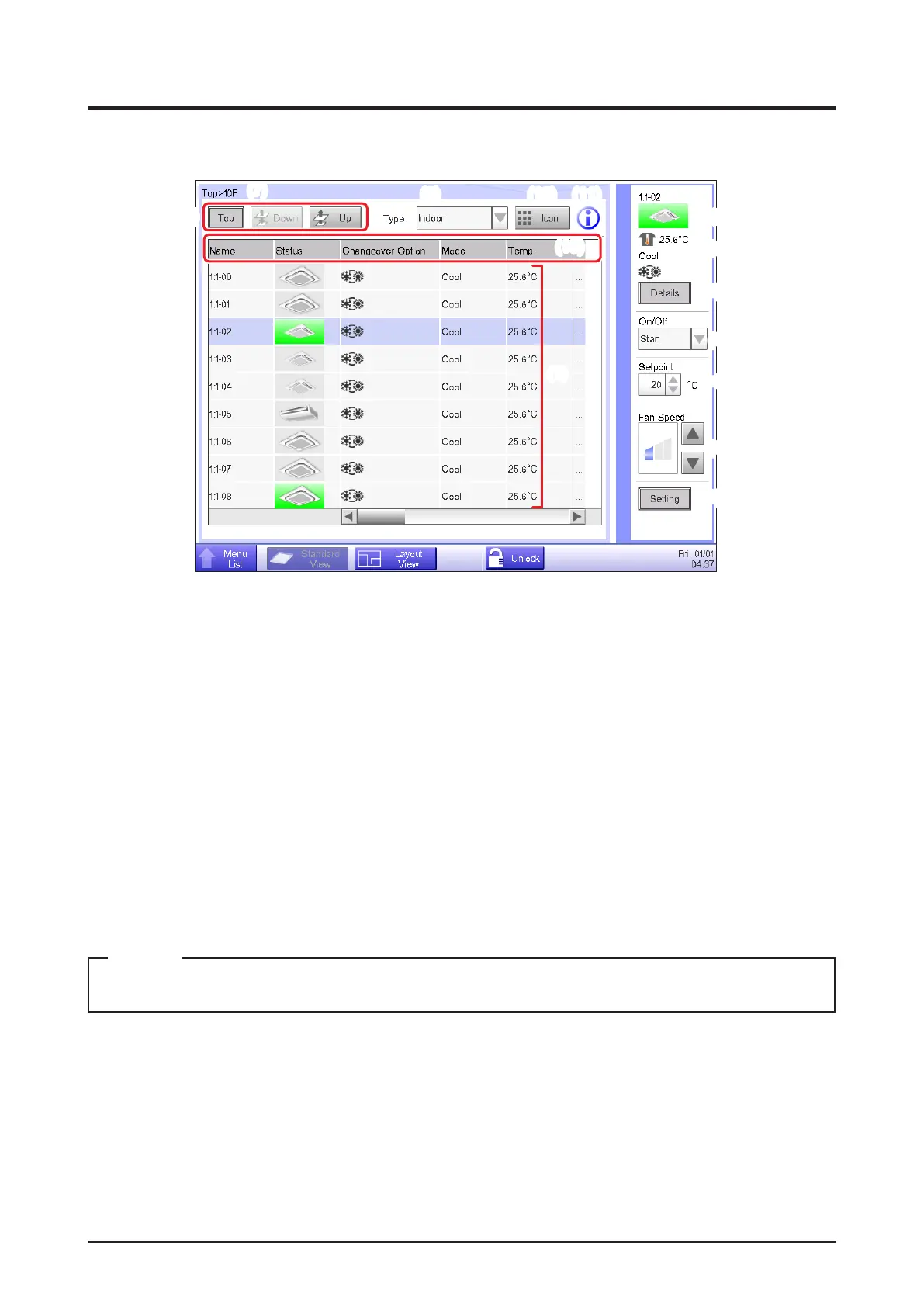 Switches the screen to the Layout View screen (optional), which displays indoor units in a oor plan.