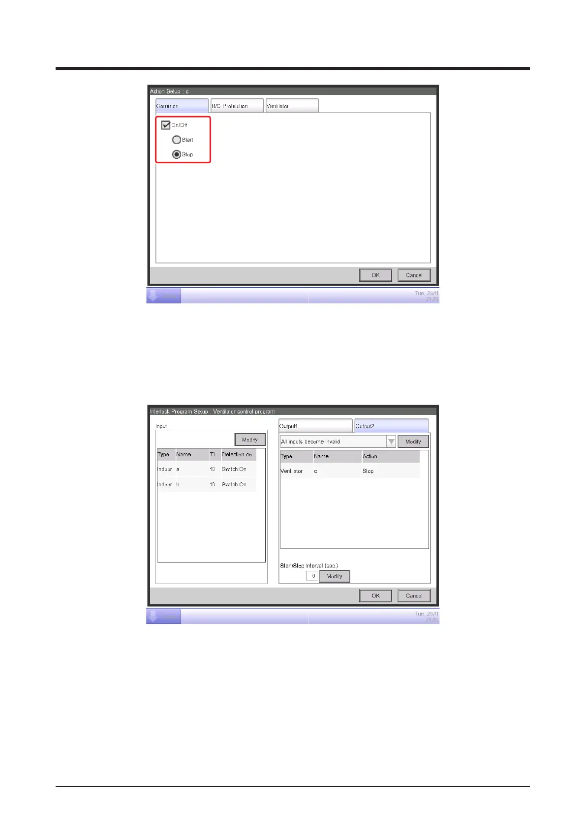 Select the On/Off check box (23), select the stop radio button, and touch the OK button to return