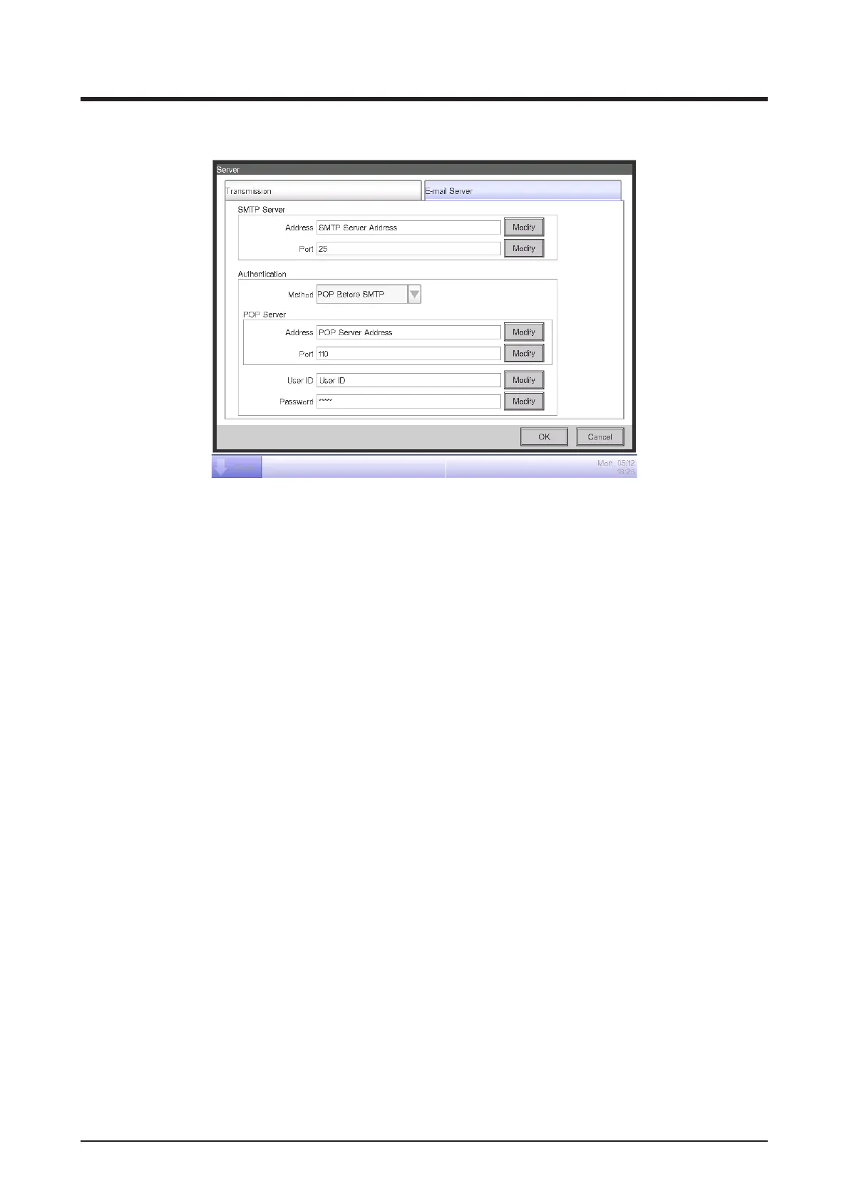 Displays information of the server that will send the E-mails. Set each item using the Modify