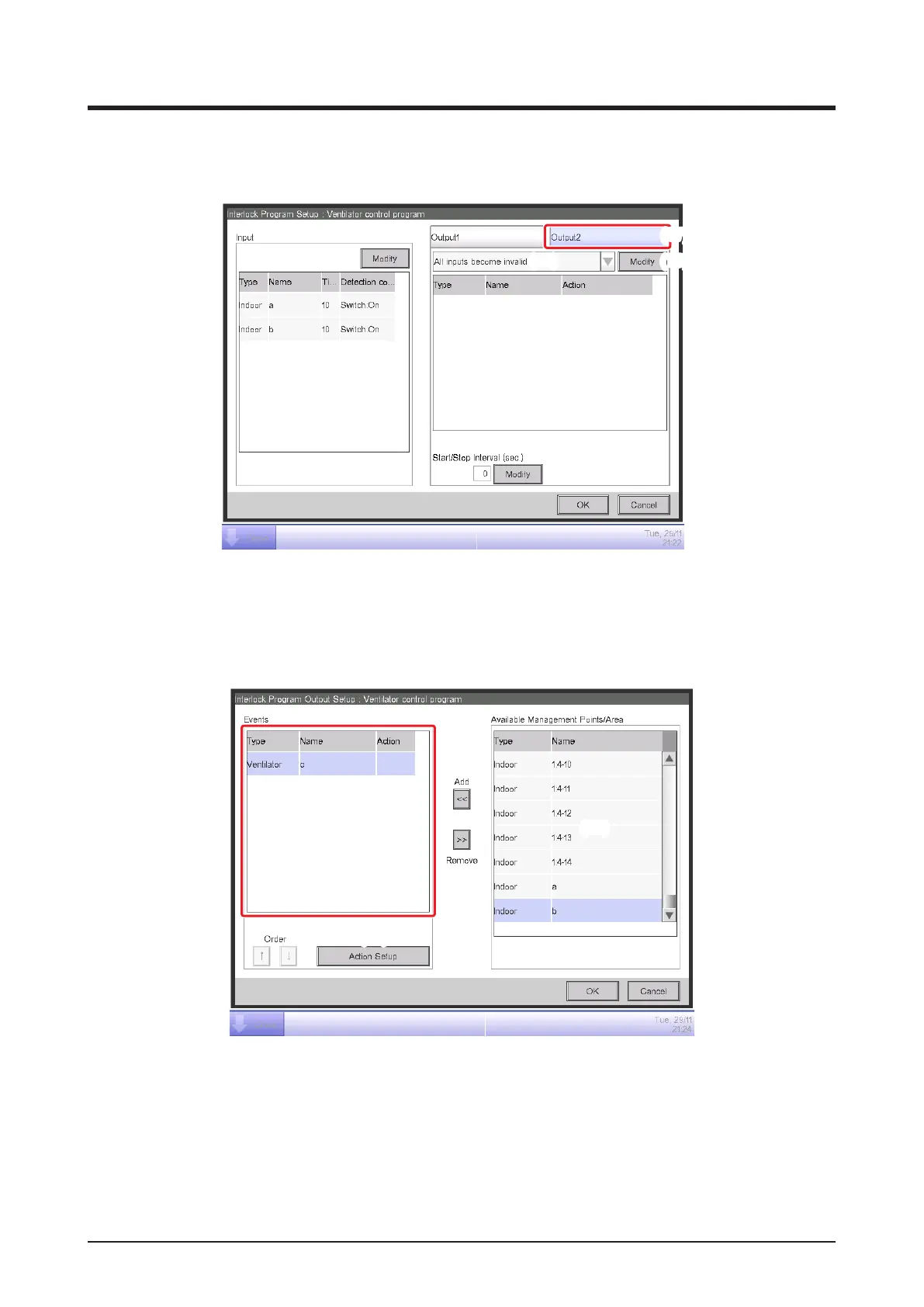 Touch the Modify button (19) and display the Interlock Program Output Setup screen.