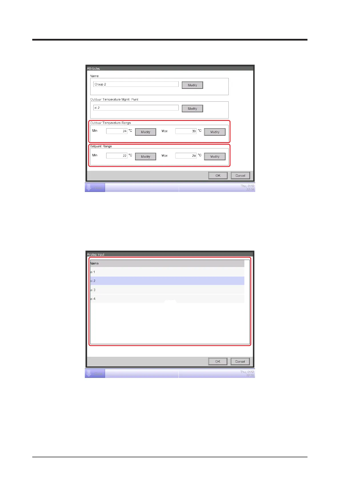 Touching the Modify button (9) displays the Analog Input screen where you can register the Ai