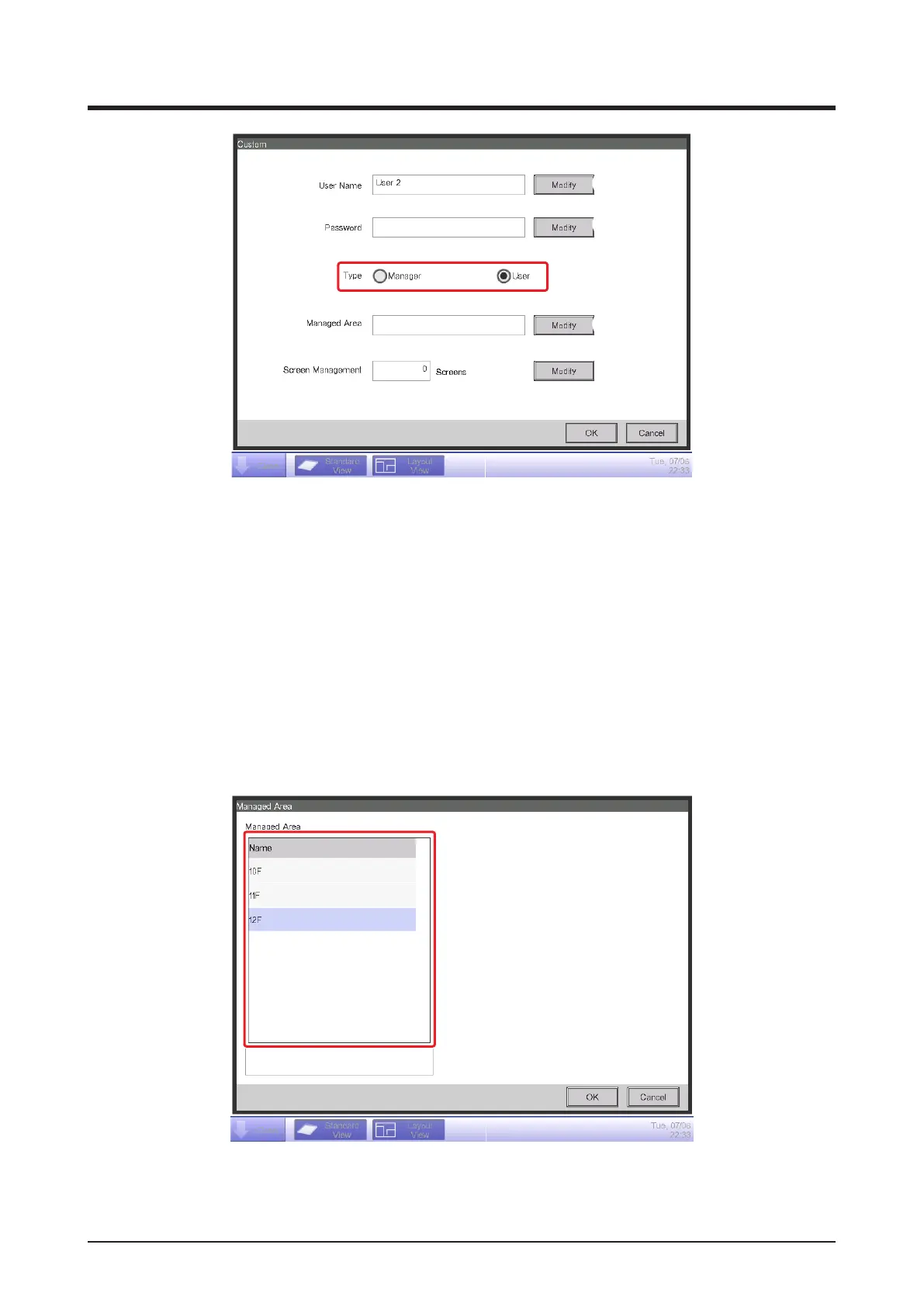In the case of a user, set up the Managed Area and Screen Management (number of Layout