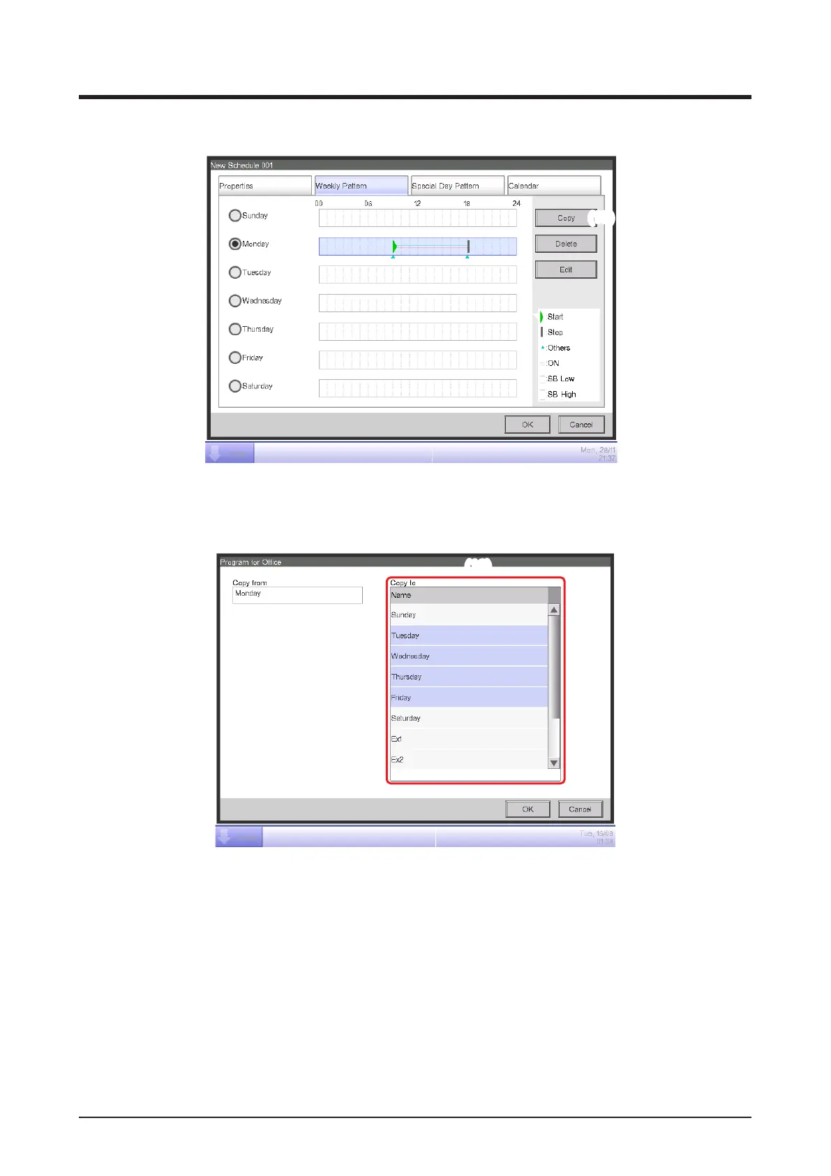 Select Monday, then touch the Copy button (15) to display the Copy to Selection screen.