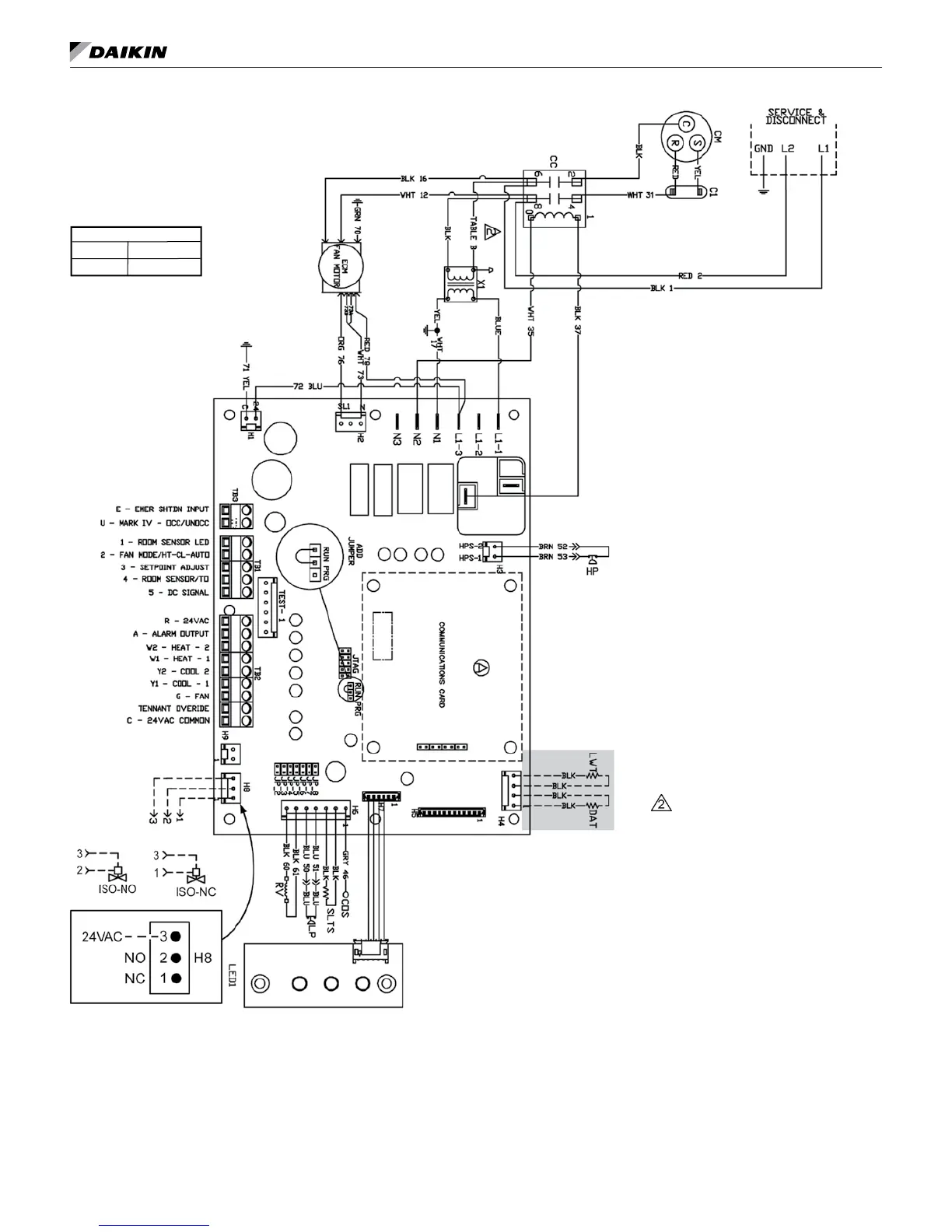 Note: Gray tinted areas in the wiring diagram: Units with factory installed communication module include Discharge Air Temperature (DAT) and