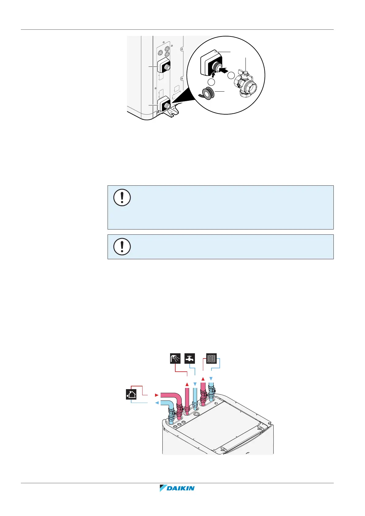 3 Connect the O-rings and shut-off valves to the space heating/cooling water