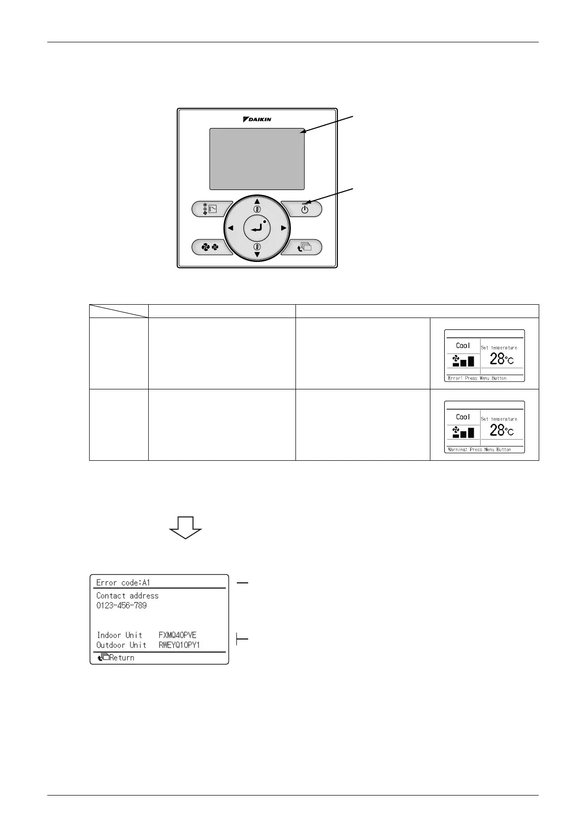 The following will be displayed on the screen when a malfunction (or a warning) occurs during operation.