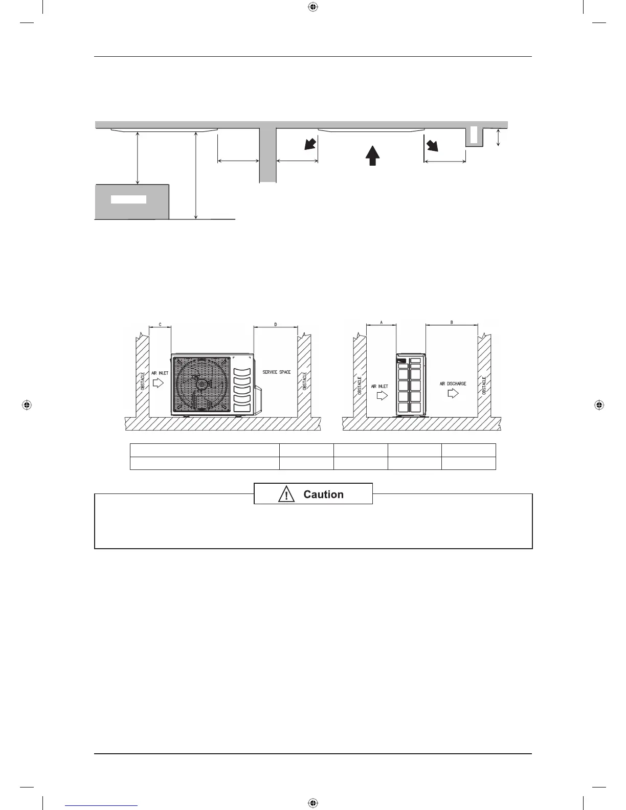 Outdoor unit must be installed such that there is no short circuit of the hot discharge air or obstruction to smooth