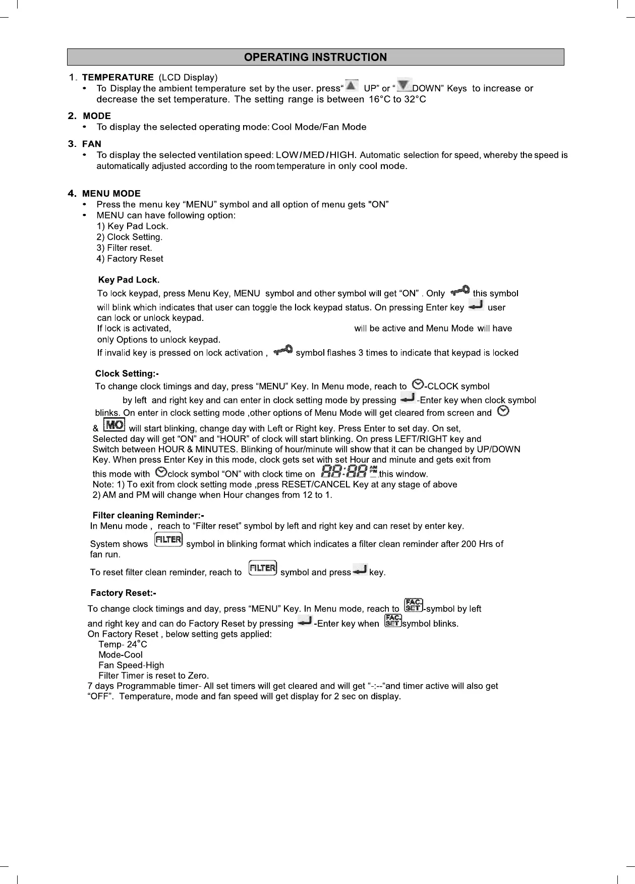Daikin FDMR36ERV16 - Operating Instructions; Operating Instructions: Temperature, Mode, Fan; Operating Instructions: Menu Mode Functions