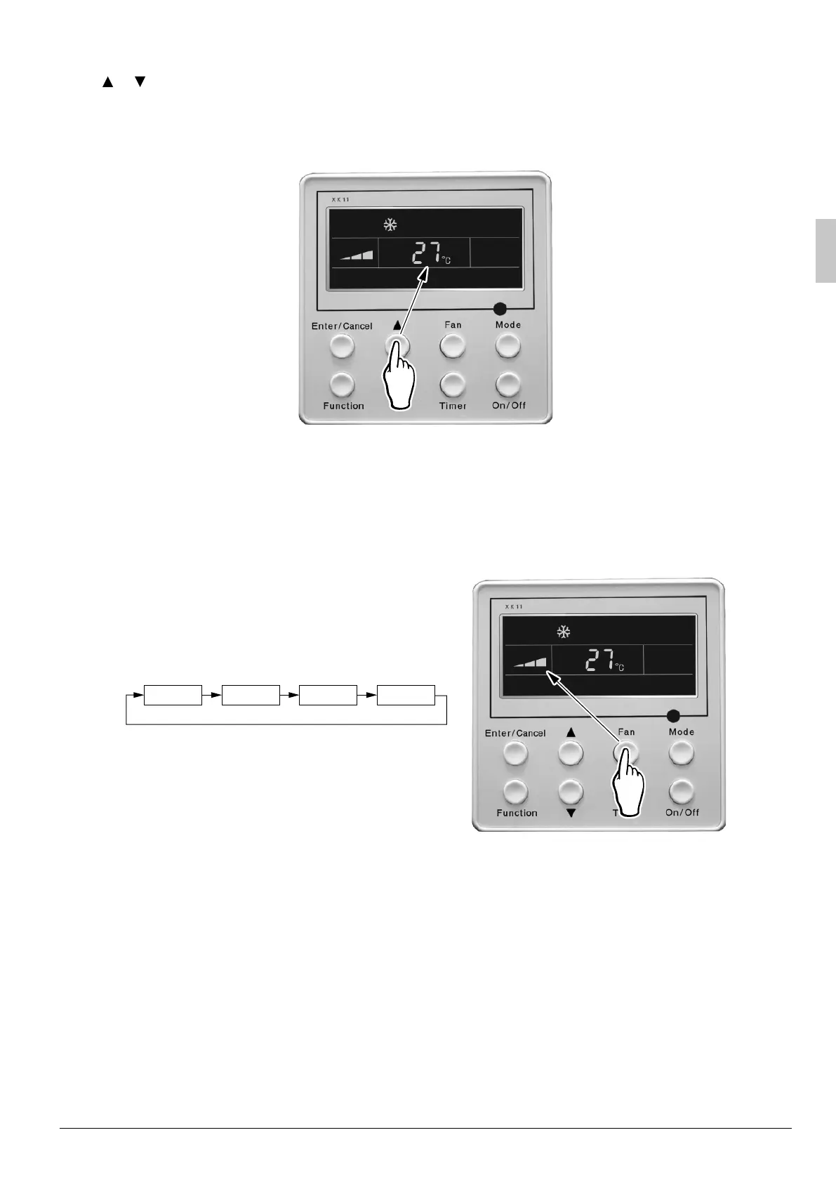 Press or button for increase or decrease of setting temperature under on-state of the unit. If press either