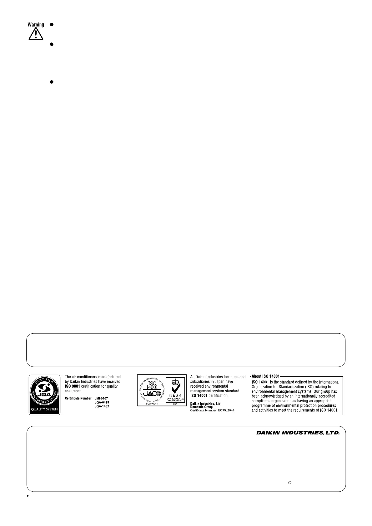 Use only those parts and accessories supplied or specified by Daikin. Ask a qualified installer or