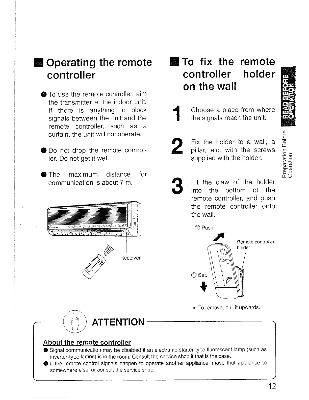 Daikin FT50GVEA - Operating the Remote Controller; To Fix the Remote Controller Holder on the Wall