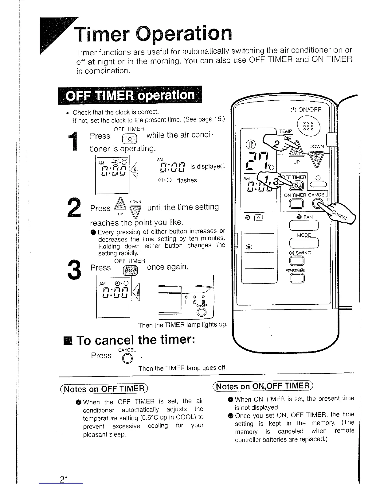 Daikin FT50GVEA - Timer Operation; Off Timer Operation; To Cancel the Timer; Notes on off Timer;On, off Timer