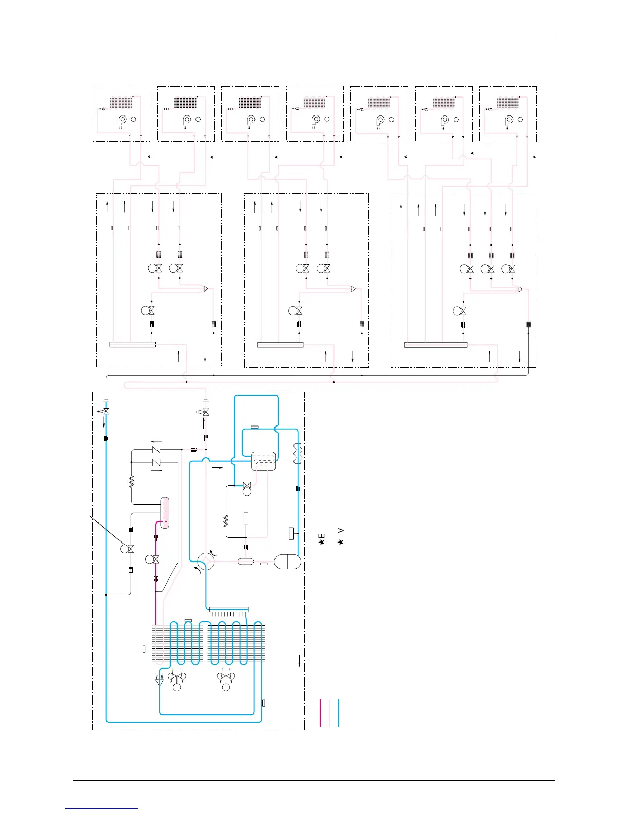 each room motorized valves (EVU·EVT) and EVG·EVL, and fully open EVP only for the