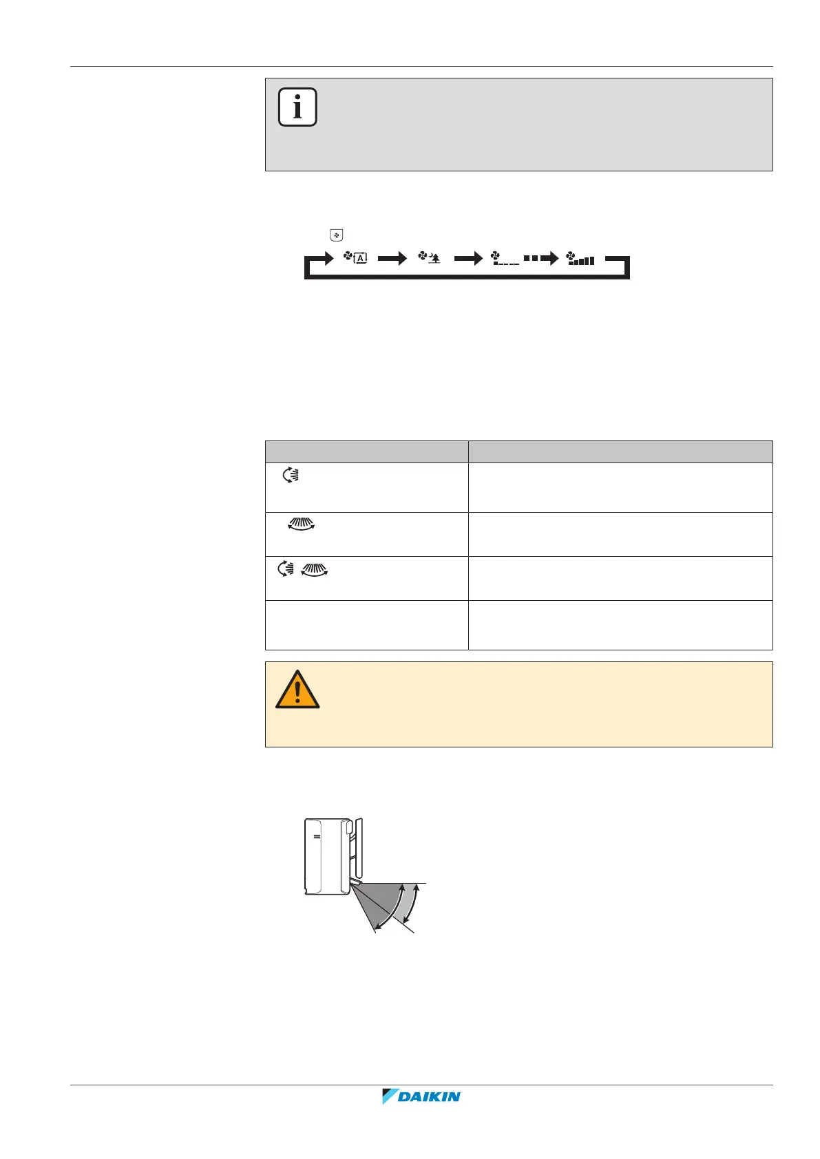 b Flap range in heating or fan only operation