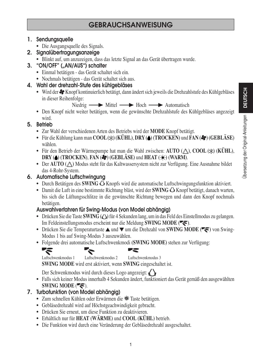 Folgende drei automatische Luftschwenkmodi (SWING MODE) stehen zur Verfügung:
