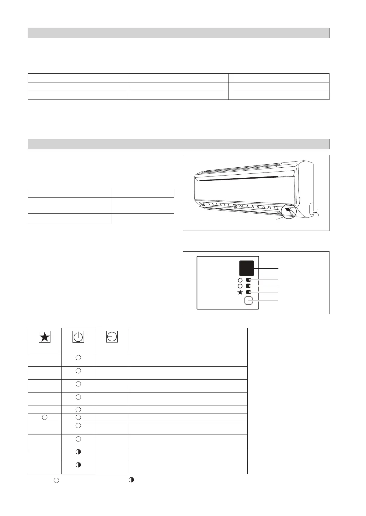 The table shows the LED indicator lights for the air conditioner