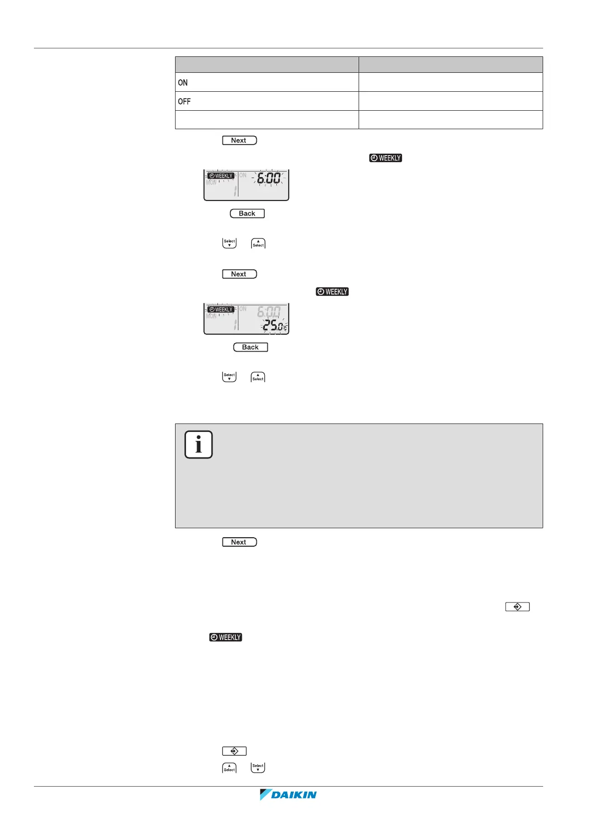 Note: The set temperature for the weekly timer is displayed only when setting the