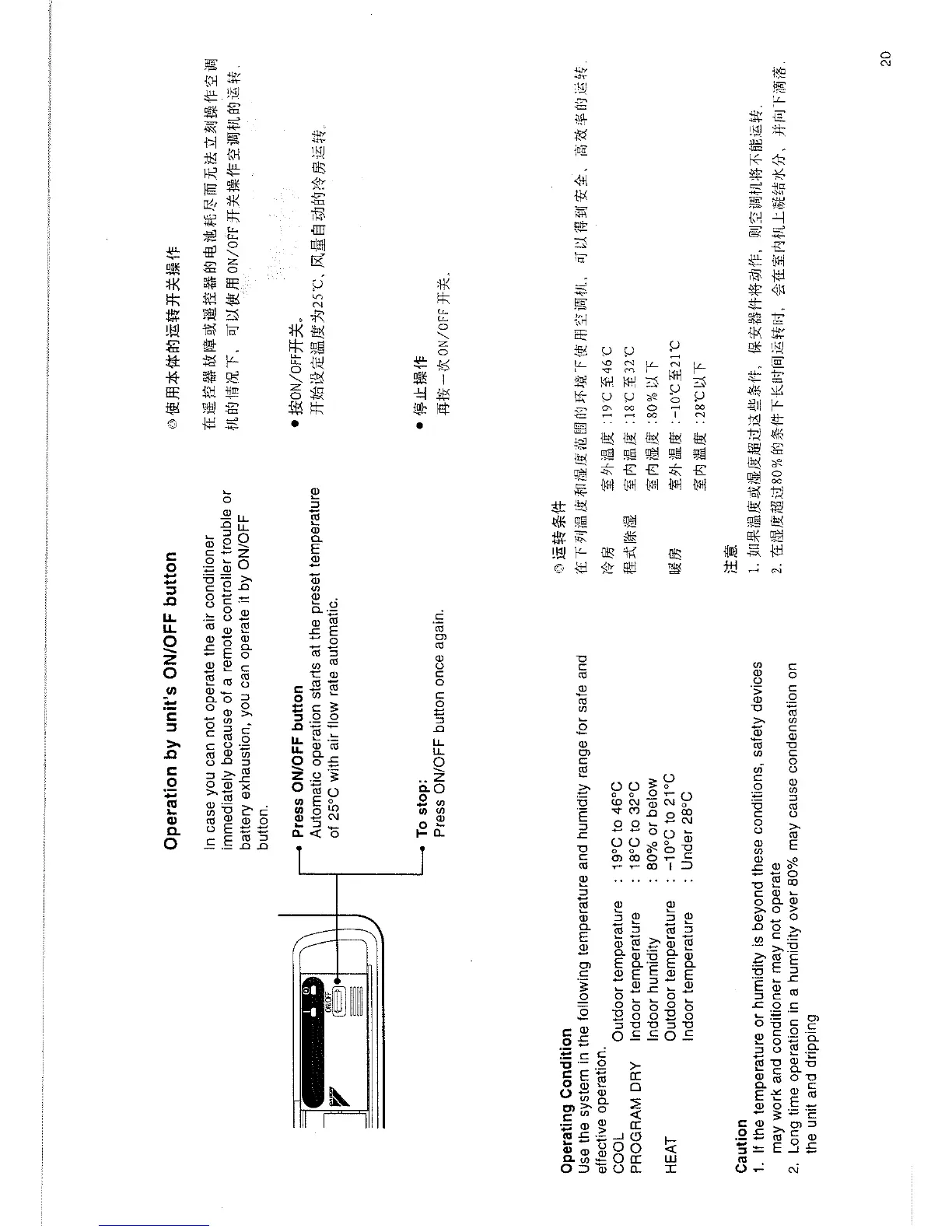 Daikin FTY25FV1C - Unit Operation Using ON;OFF Button; Operating Conditions; Unit Operation Cautions