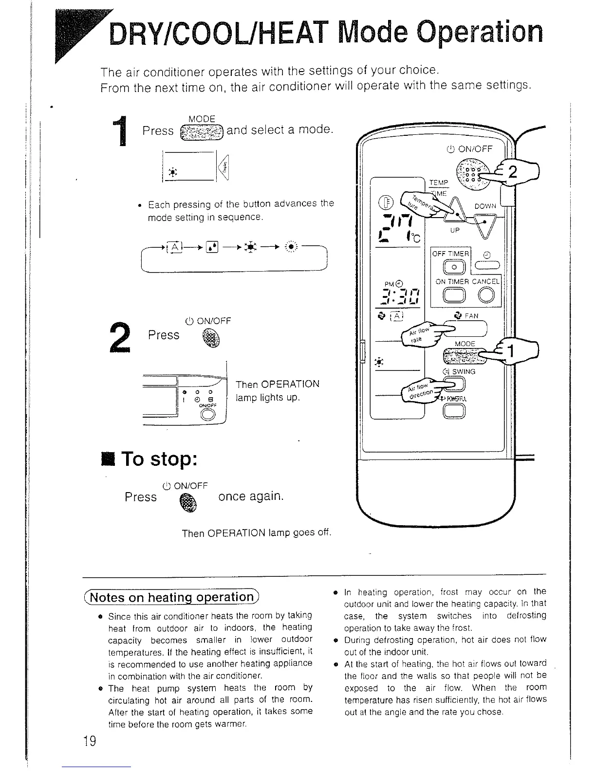 Daikin FTY50GV1A - DRY, COOL, and HEAT Mode Operation; Selecting Operation Mode; Stopping Operation; Heating Operation Notes