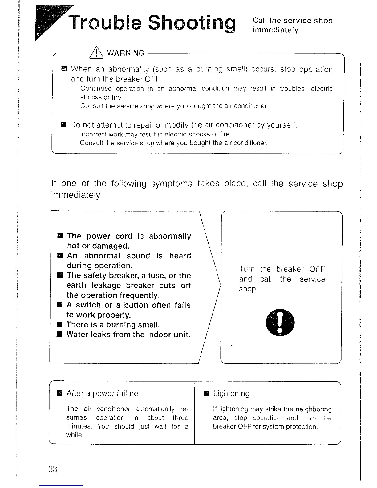 Daikin FTY60GV1A - Troubleshooting Critical Issues and Service; Critical Problems, Service Calls, and Power Issues