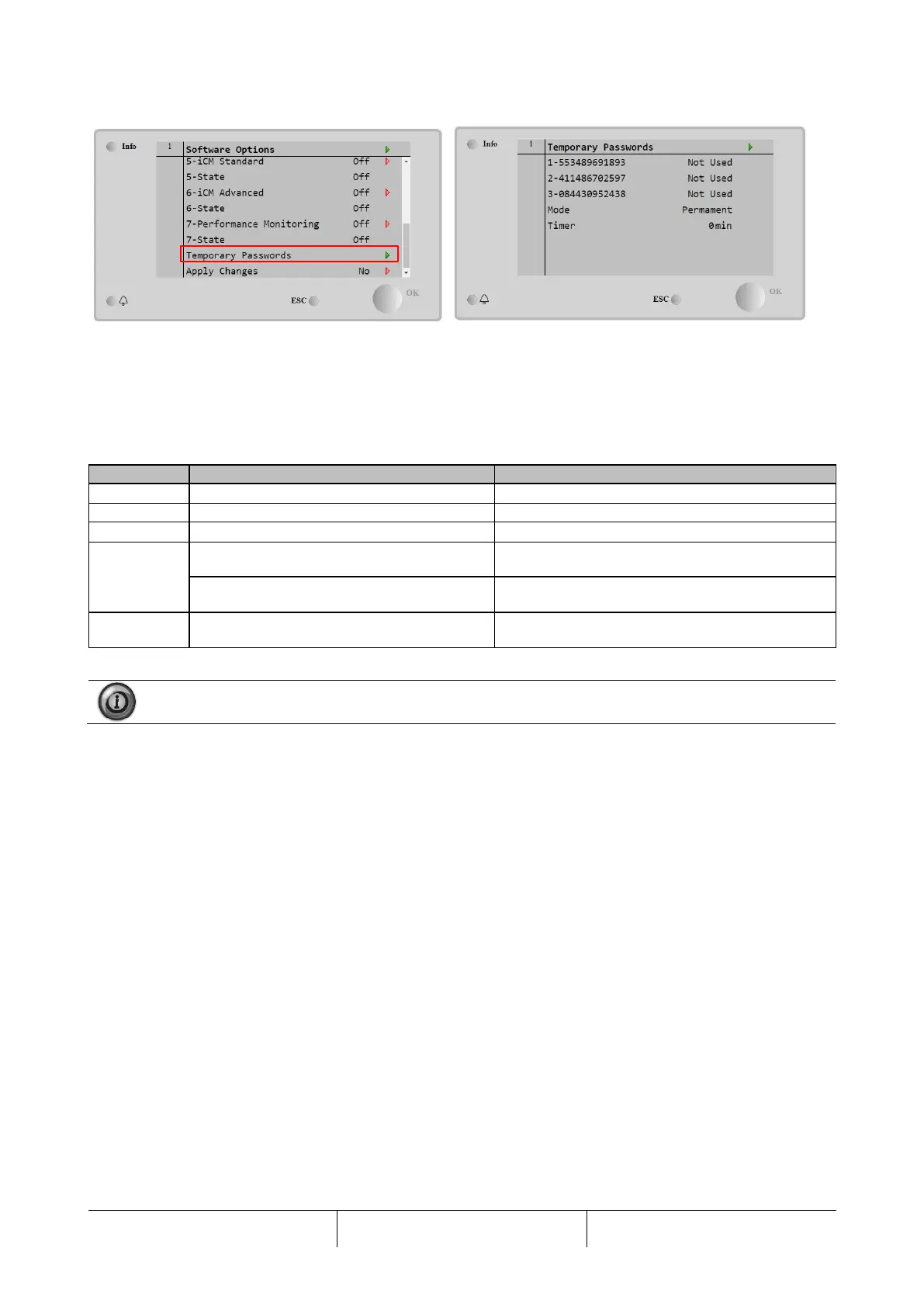 Main Menu→Commission Unit→Configuration→Software Options→Temporary Passwords
