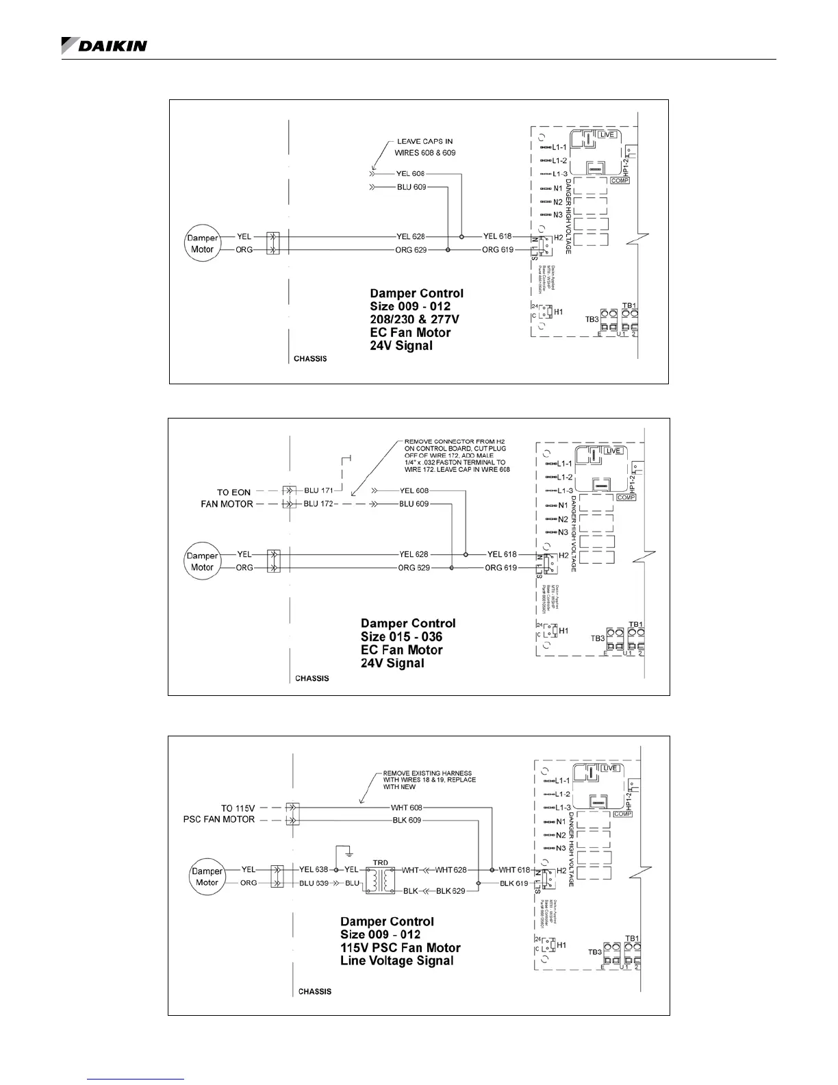 Figure 42: Damper control wiring, sizes 009-012 with 208/230V and 277V fan motor control