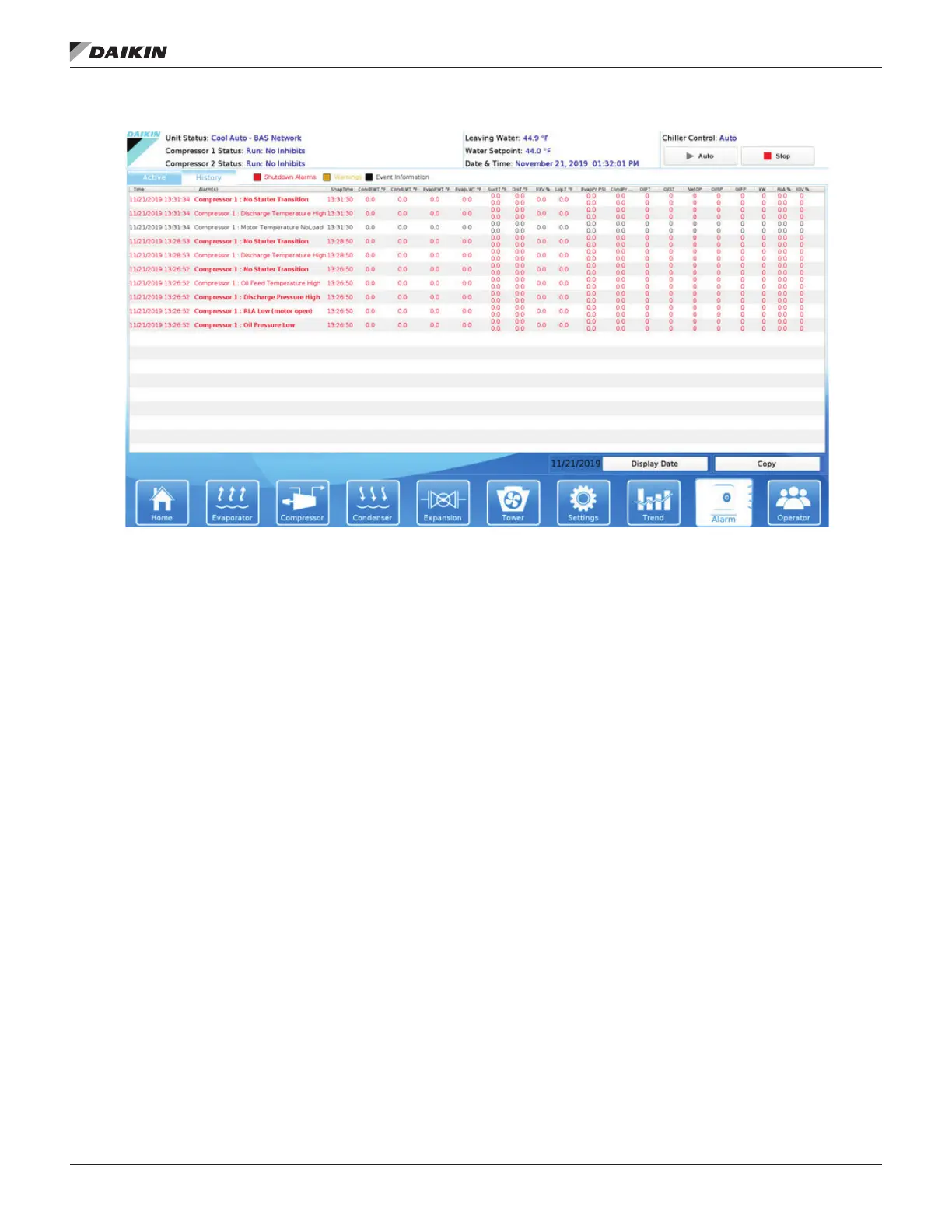 alarm history for the selected day. (The Unit Control
