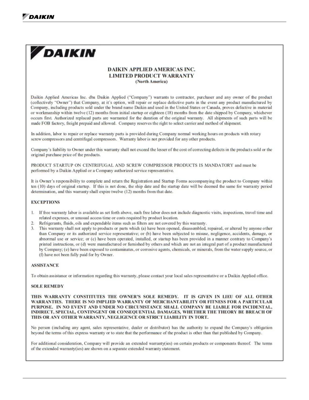 Daikin WGZ030DW - Limited Product Warranty
