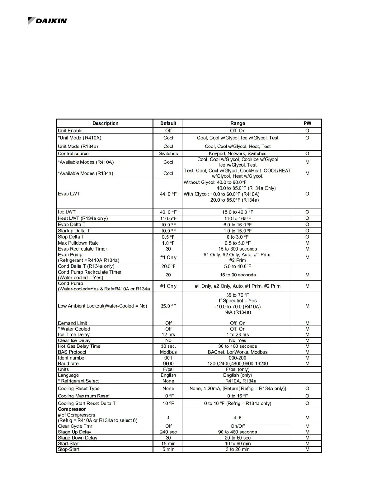 Table 45: Setpoints (setpoints with * are set at Daikin Applied factory)