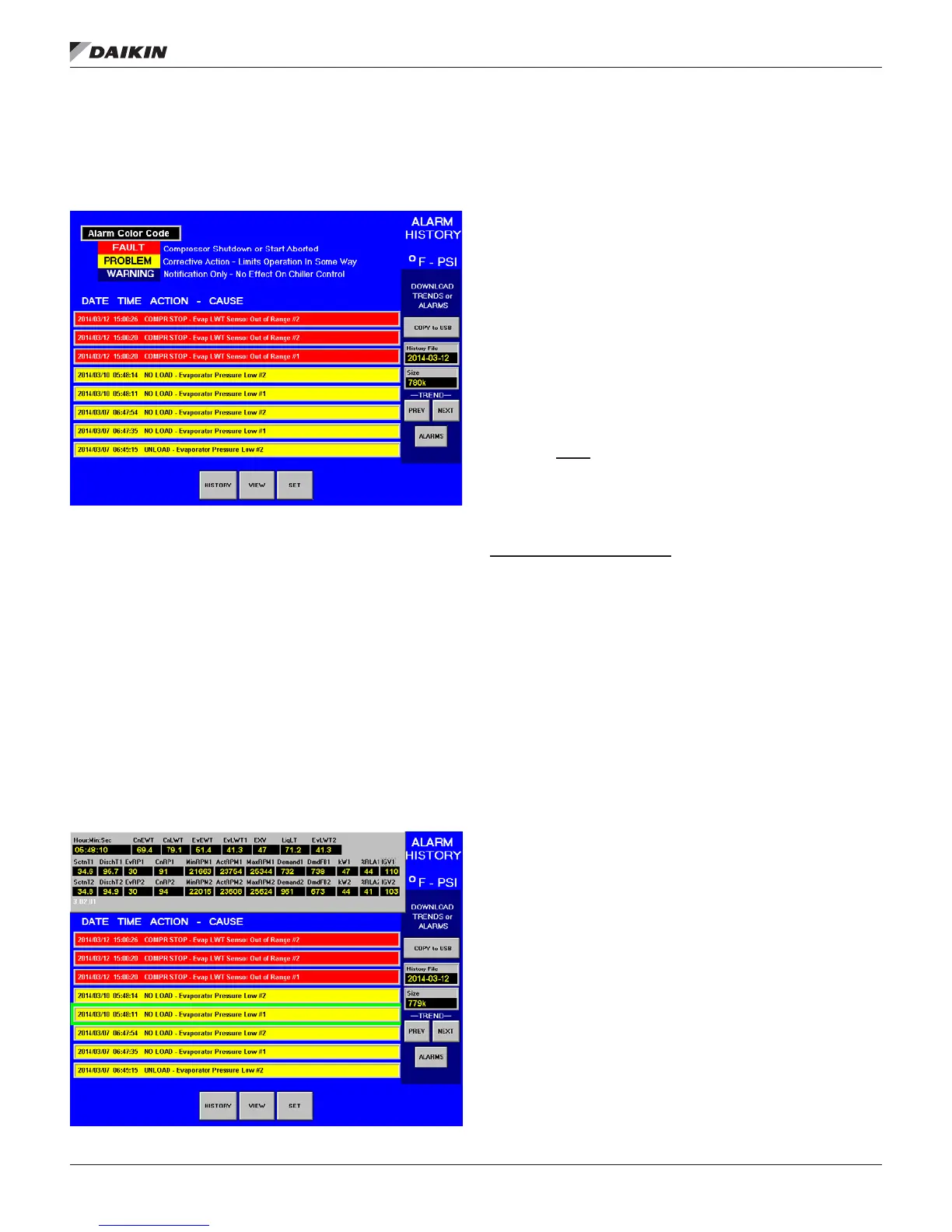 The Alarm History Screen can be used to download the trend