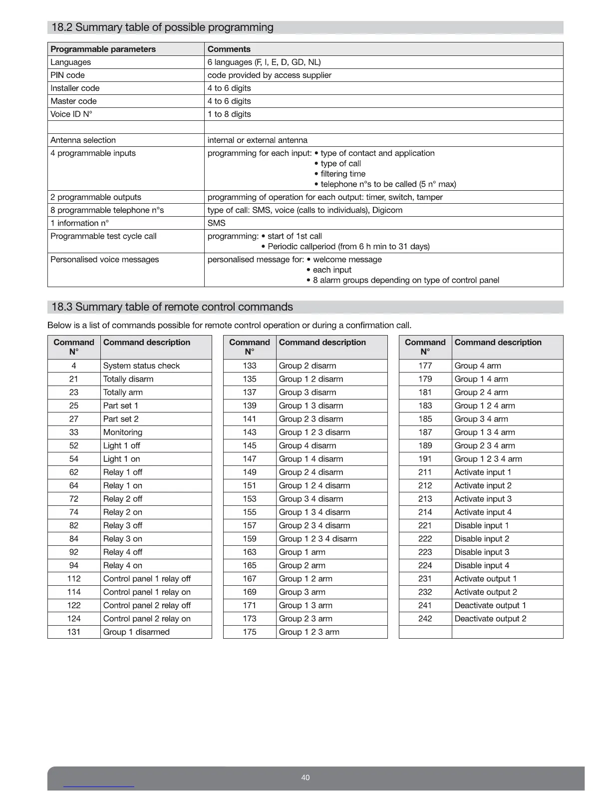 DAITEM 473-29X - Summary Table of Possible Programming; Summary Table of Remote Control Commands