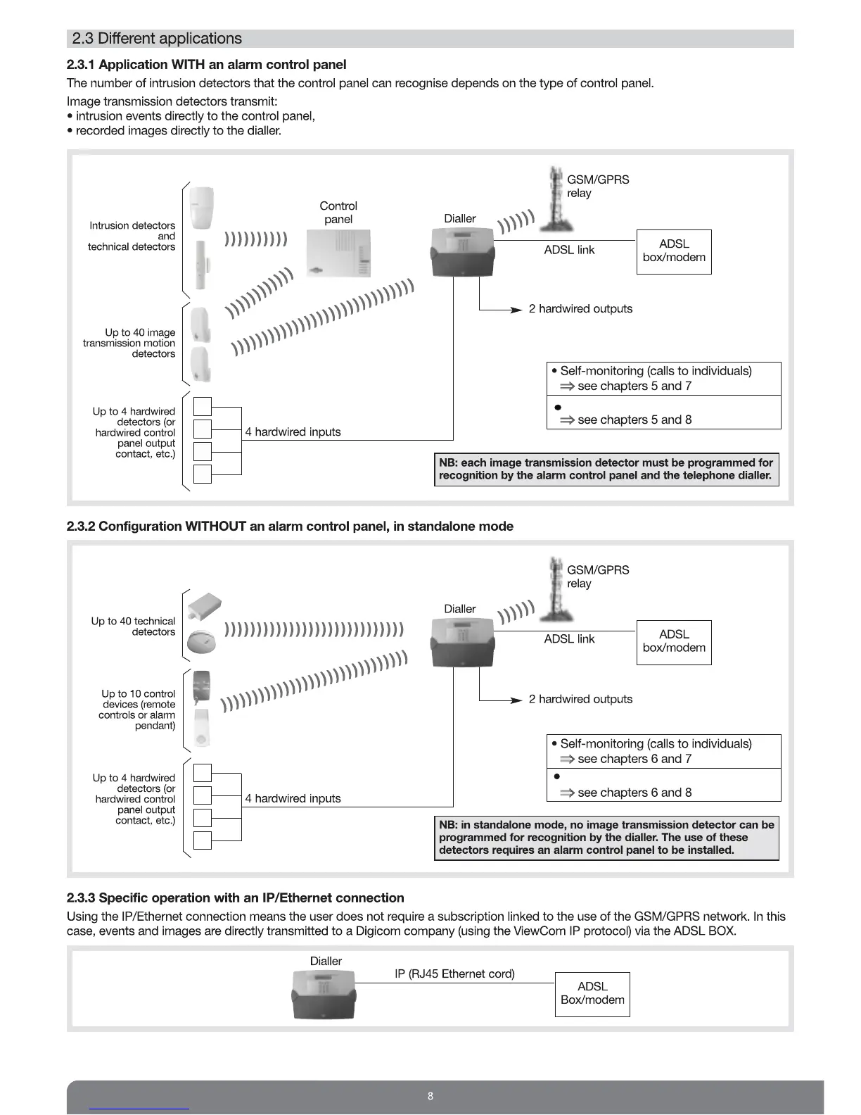 DAITEM 473-29X - Different Applications; Application with an Alarm Control Panel; Configuration Without an Alarm Control Panel, in Standalone Mode; Specific Operation with an Ip;Ethernet Connection