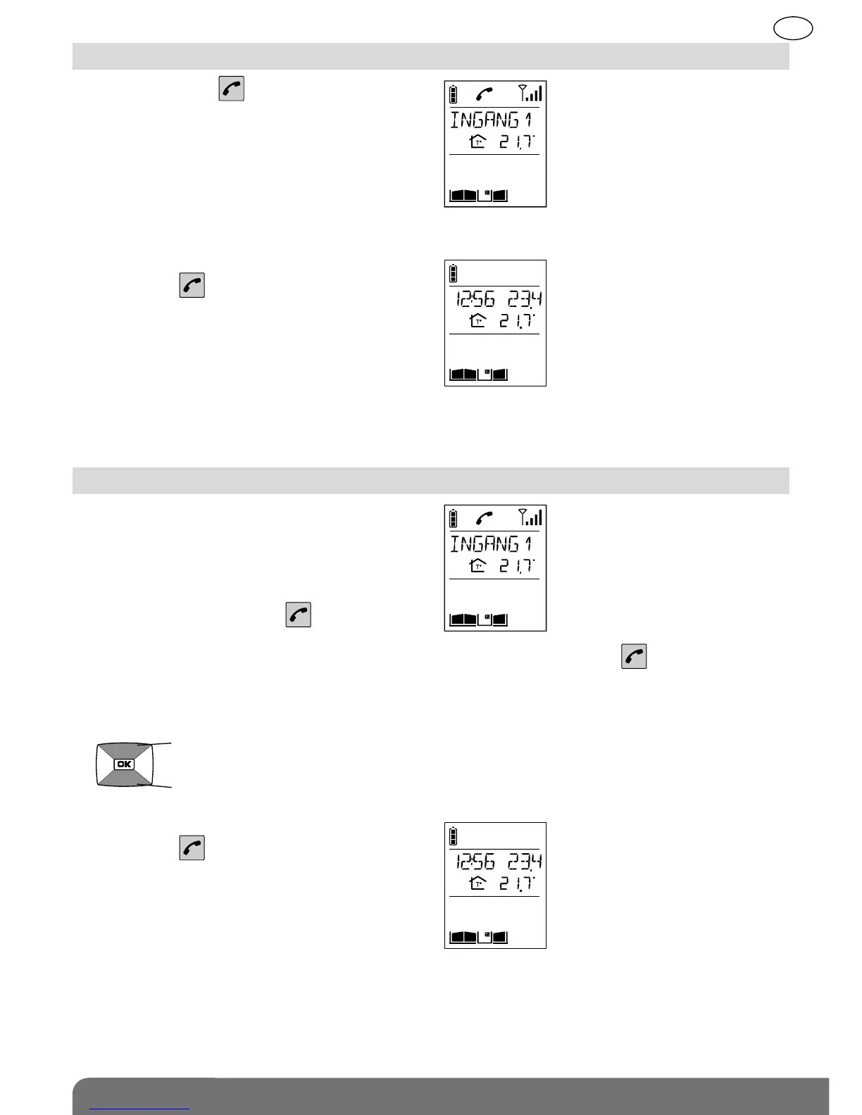 2. Indien de handset zich al buiten zijn basis bevindt, druk dan op de toets .
