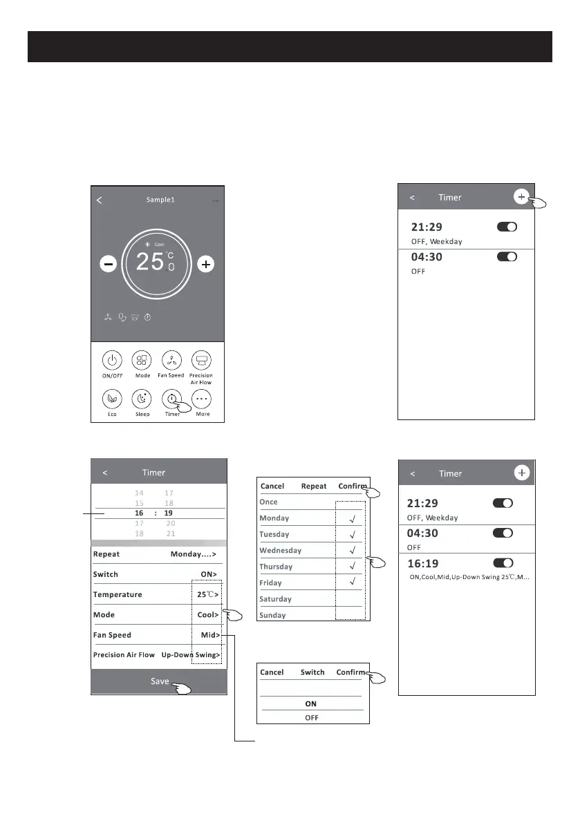 3. Congure Time/Repeat Date/Switch(ON)/Temperature/Mode/Fan speed/Air Flow como usted