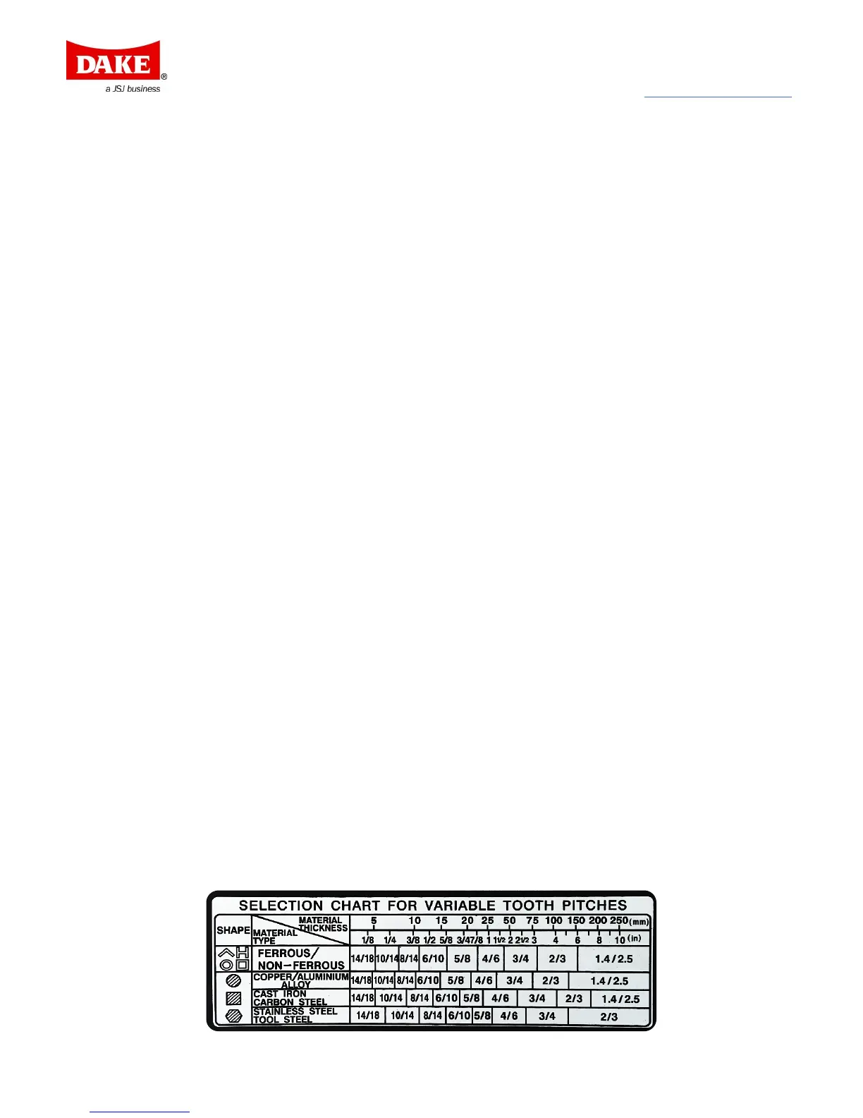 Located on the saw is a chart to determine the tooth pitch or TPI needed for cutting various
