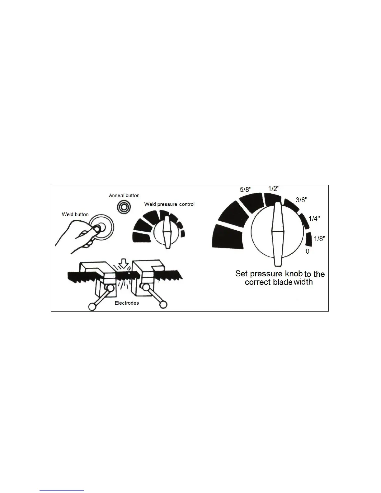 4. Press and hold welder button. Do not release until the blade joint is “red” hot.