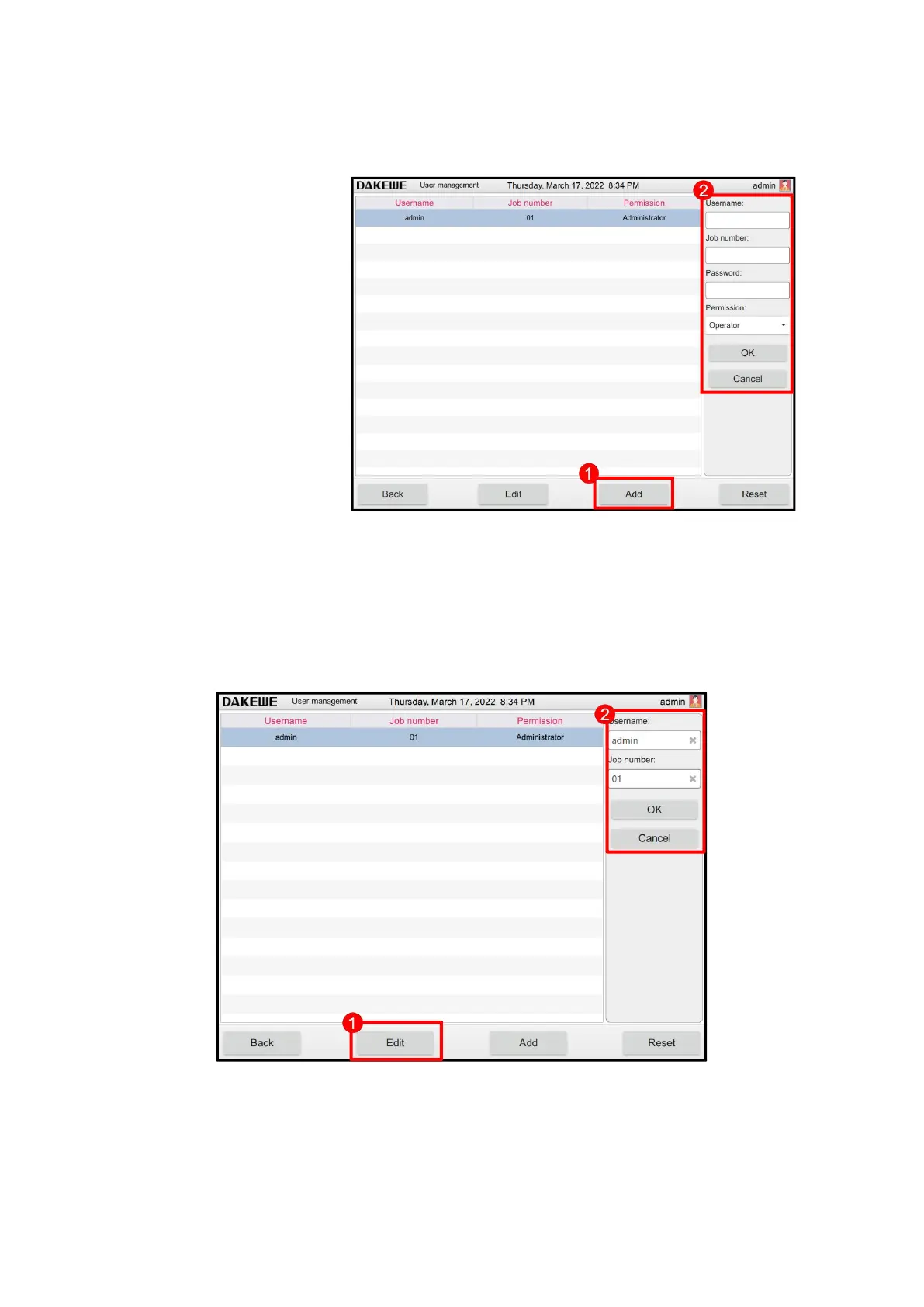can re-edit user names and work codes (Figure 44-2). Click OK button for saving after