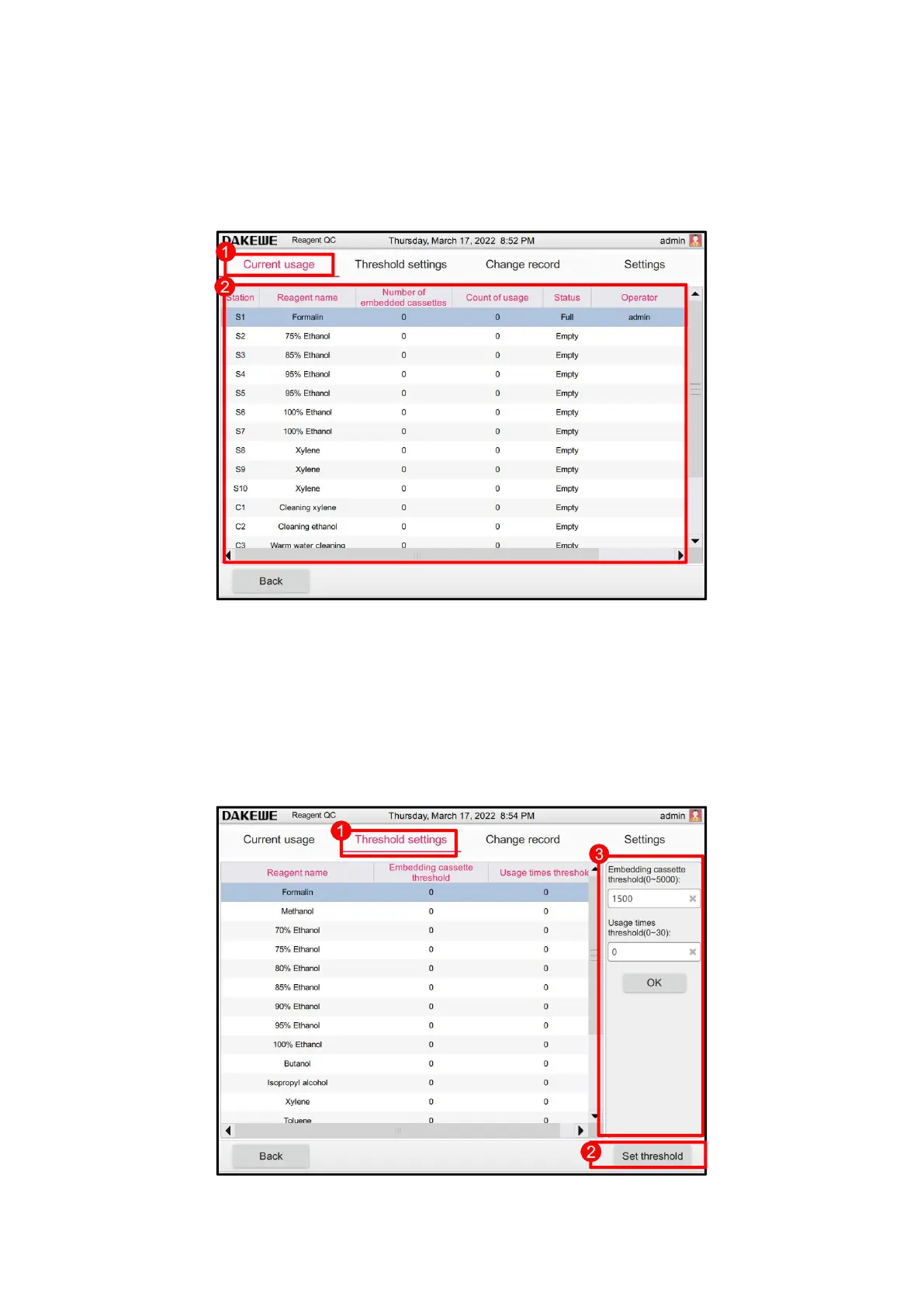 Touch the “Threshold Setting” column (Figure 61-1). Touch to select any reagent. Then, click the