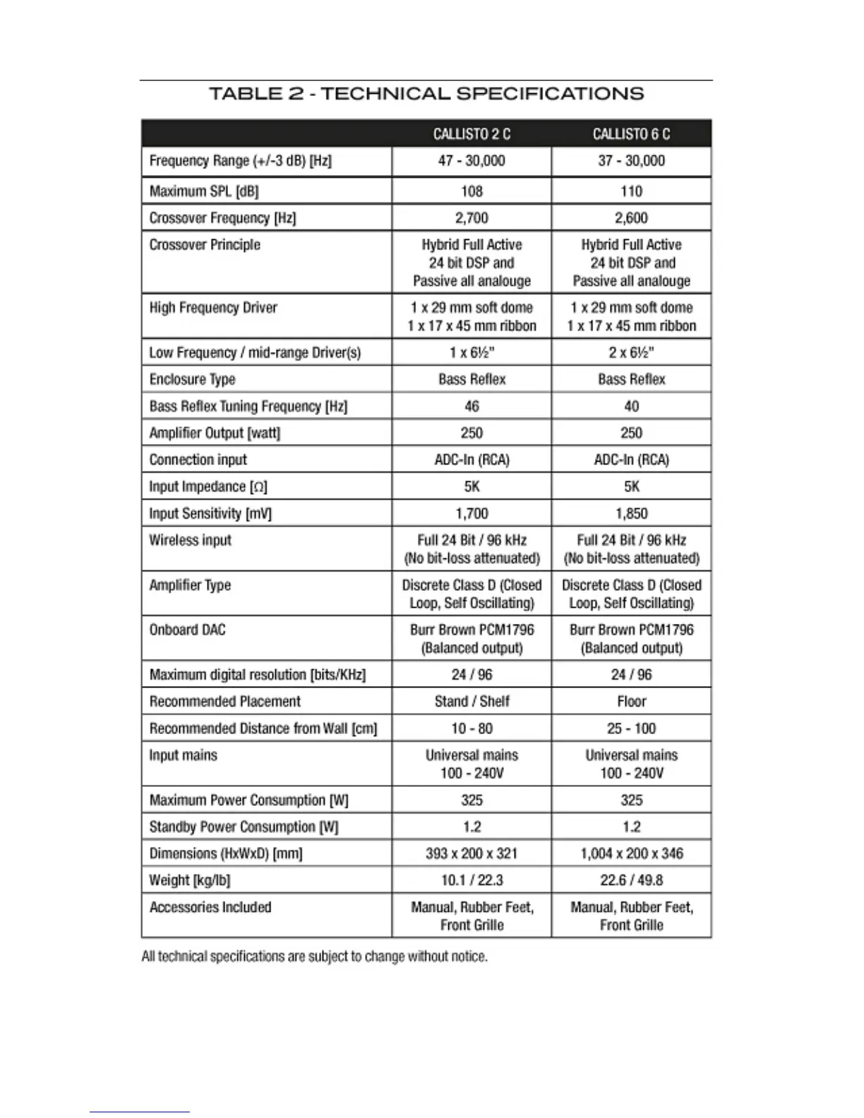 Dali CALLISTO - Technical Specifications