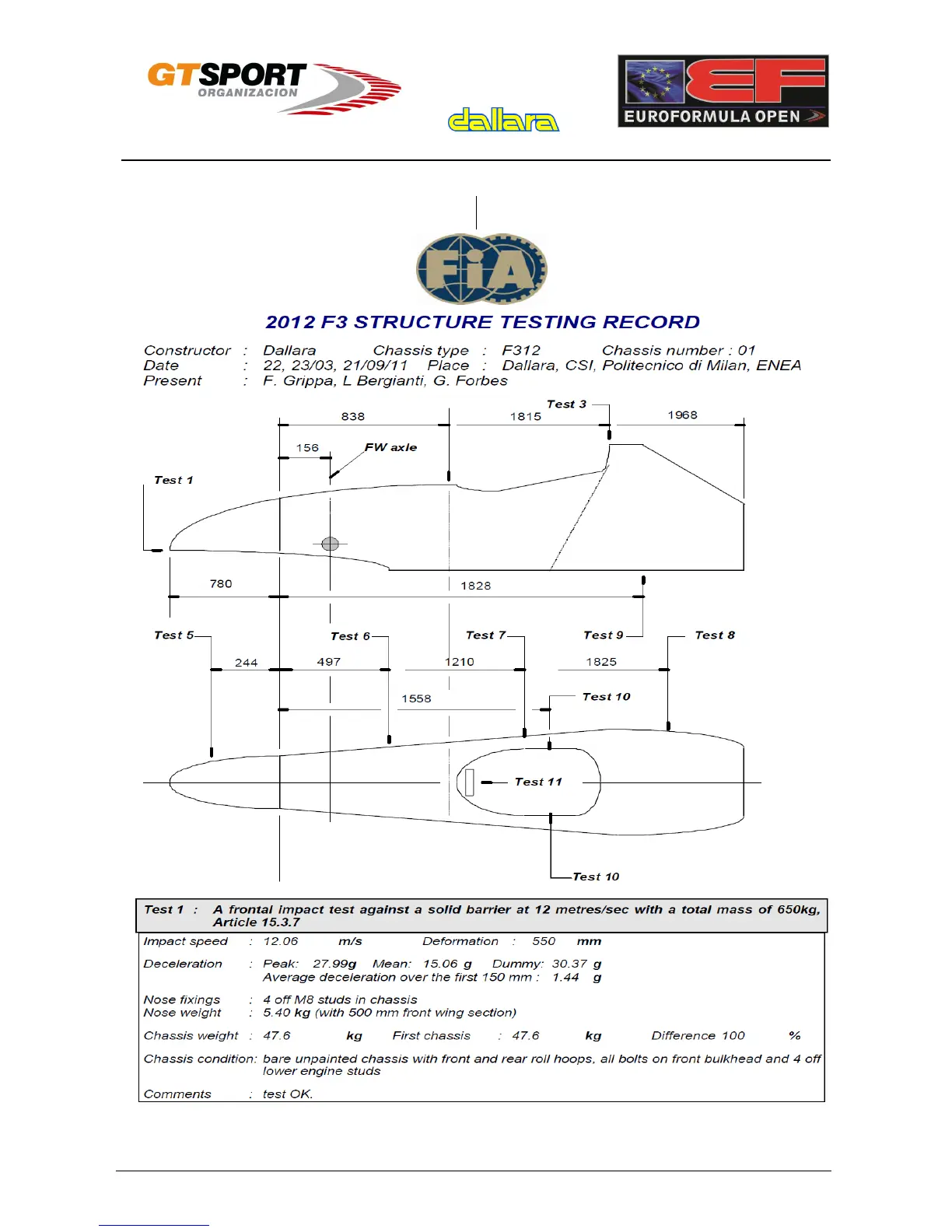 dallara F-312 - 2012 F3 FIA Structure Testing Record; Test FIA de la Estructura 2012