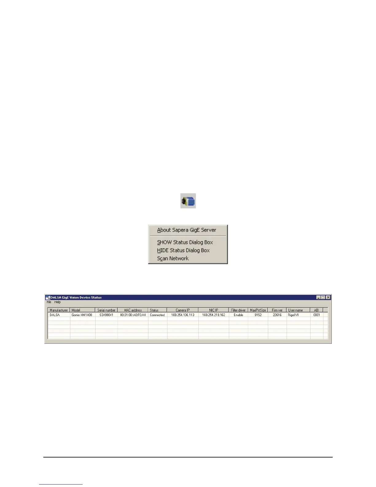 Click on Show Status to open a window listing all devices connected to the host system. Each GigE device is listed