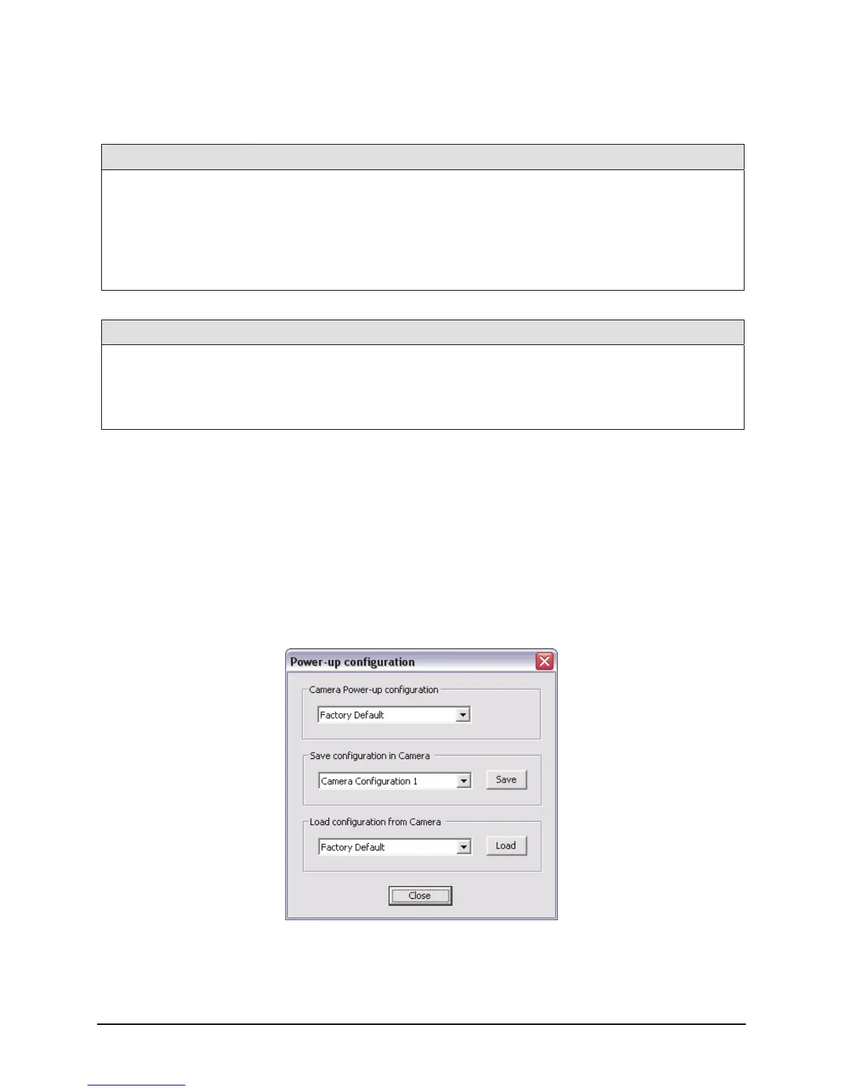 The Power-up configuration dialog allows you to specify the camera configuration to load when powering-up the