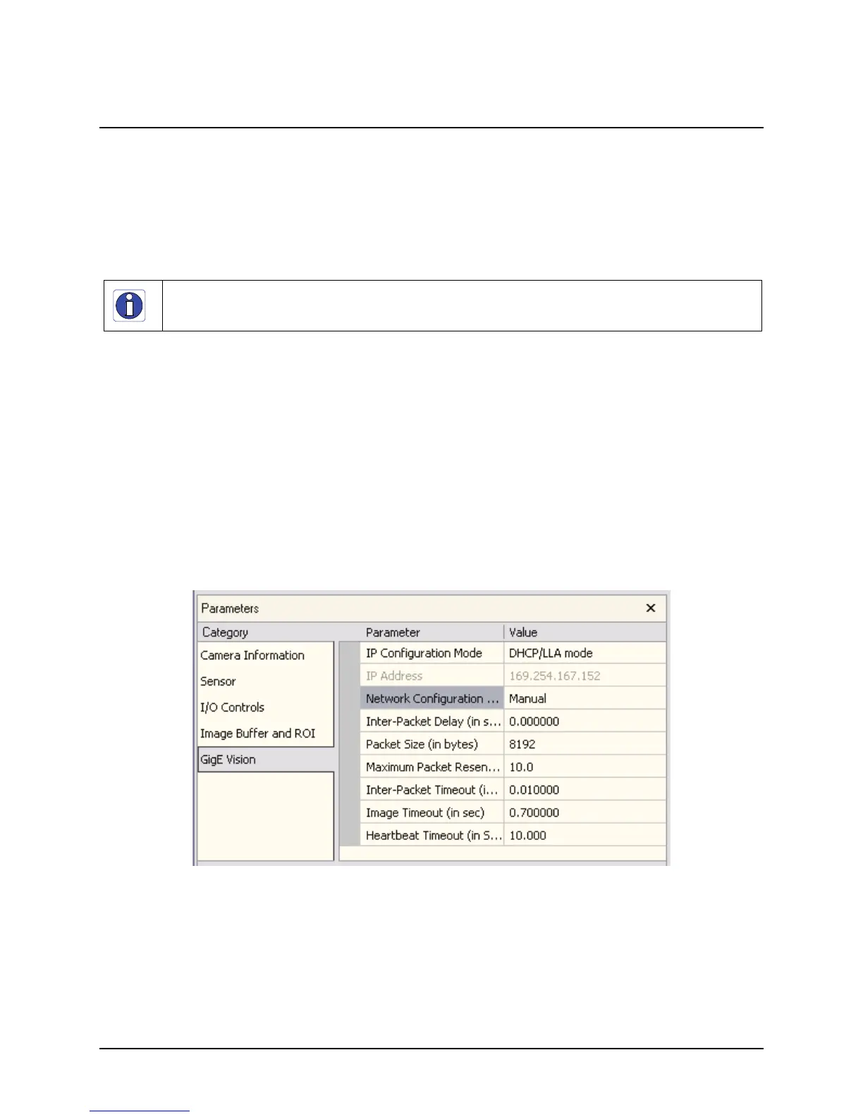 Select the GigE Vision category. The Automatic Network Configuration mode sets parameters to a default state.