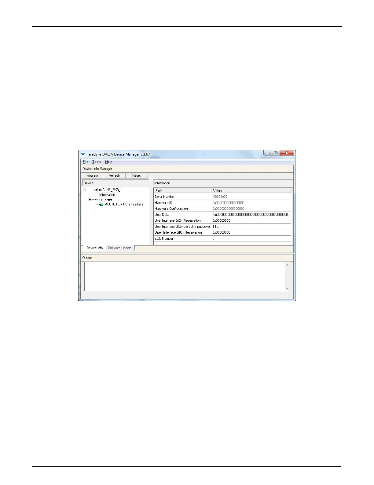 The following screen image shows the Device Manager program with the Information/Firmware tab