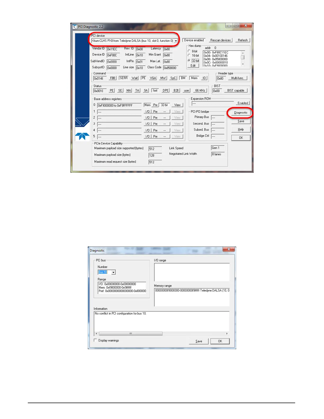 button. A file named ‘pcidiag.txt’ is created (in the Sapera\bin directory) with a dump of the PCI