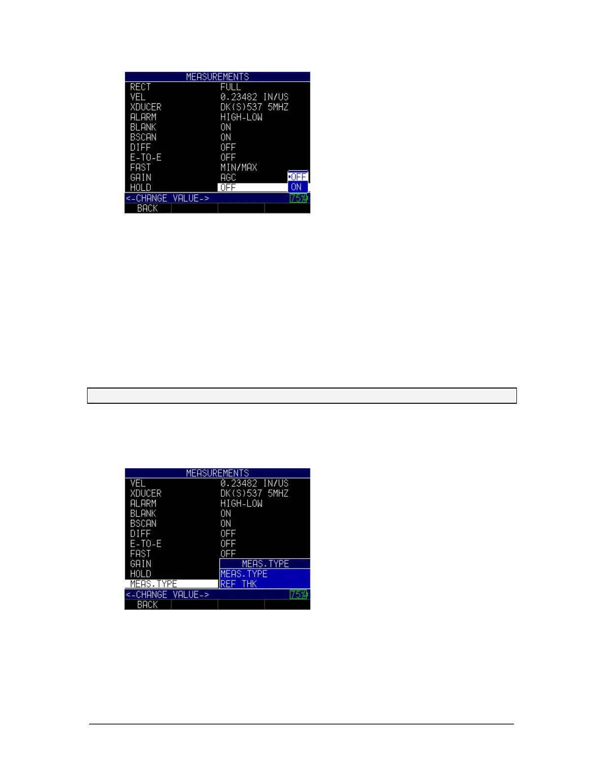 Meas. Type: Choose either the Thickness or Velocity setting. You must always