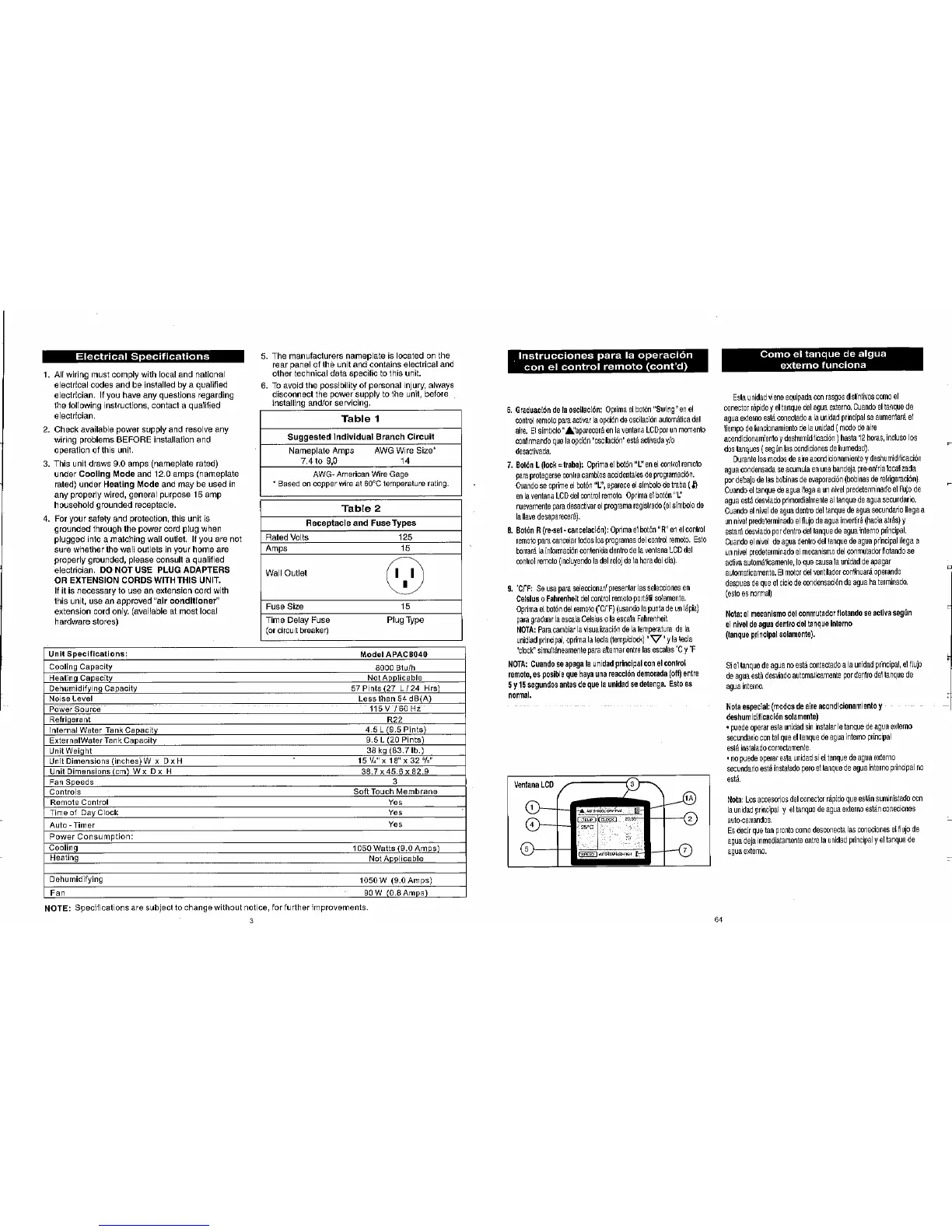 Danby APAC8040 - Technical Specifications; Electrical Specifications; Unit Specifications; Remote Control and Water Tank Operation