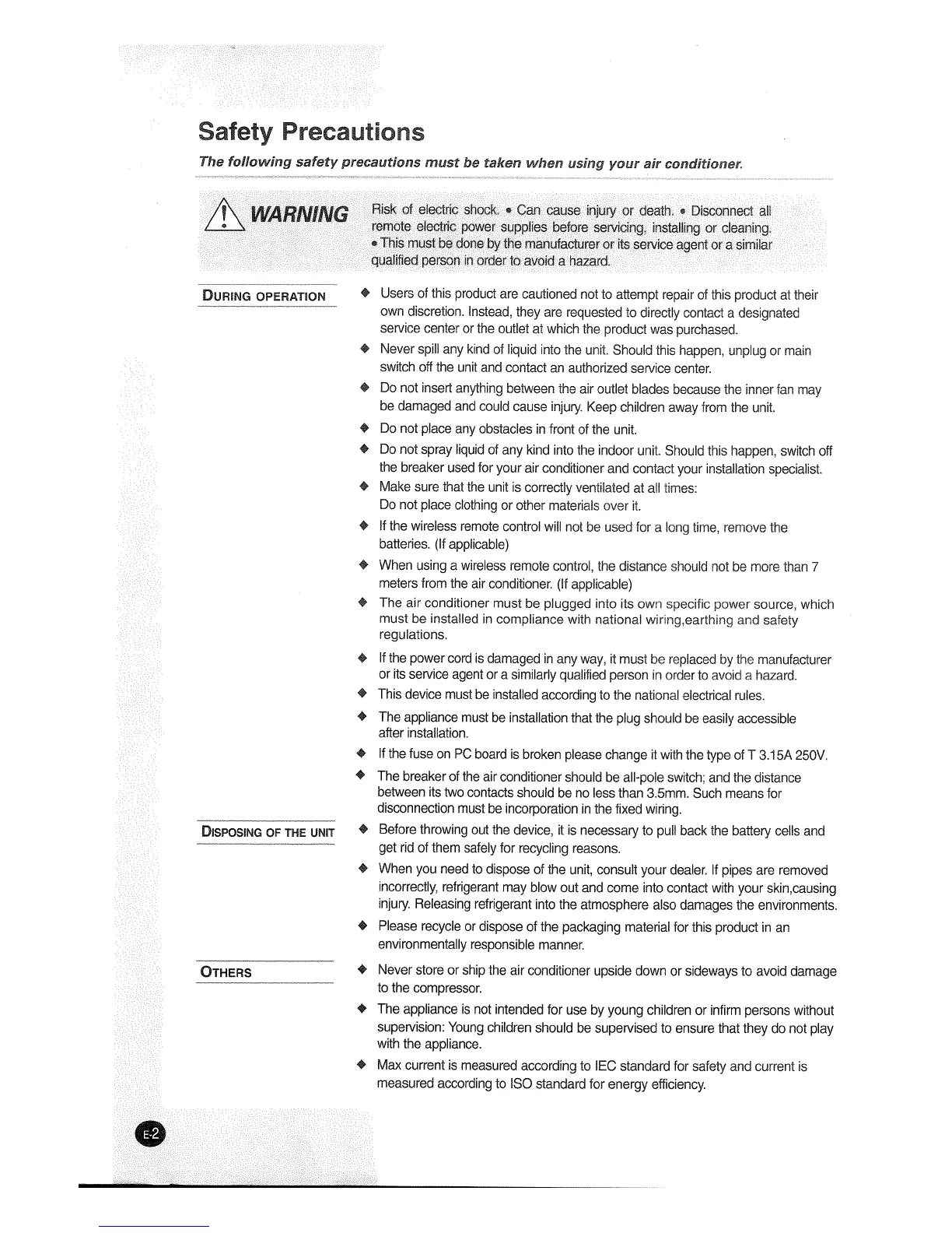 Danby DAC12078EE - Safety Precautions; During Operation Safety; Unit Disposal Safety; Other Safety Notes