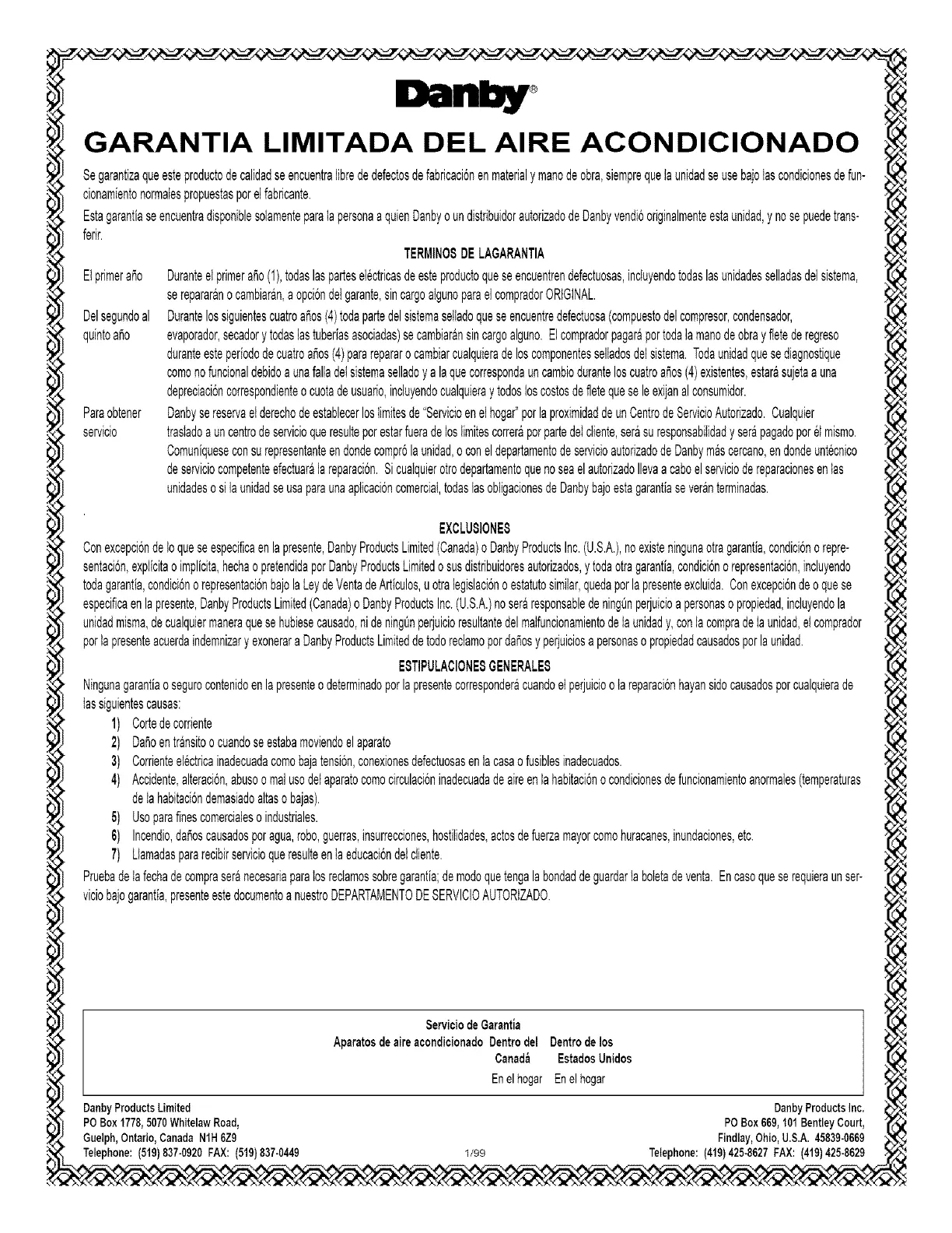 especificaenlapresente,DanbyProductsLimited(Canada)oDanbyProductsInc.(U.S.A.)noser&responsabledeningQnperjuicioapersonasopropiedad,inchyendola