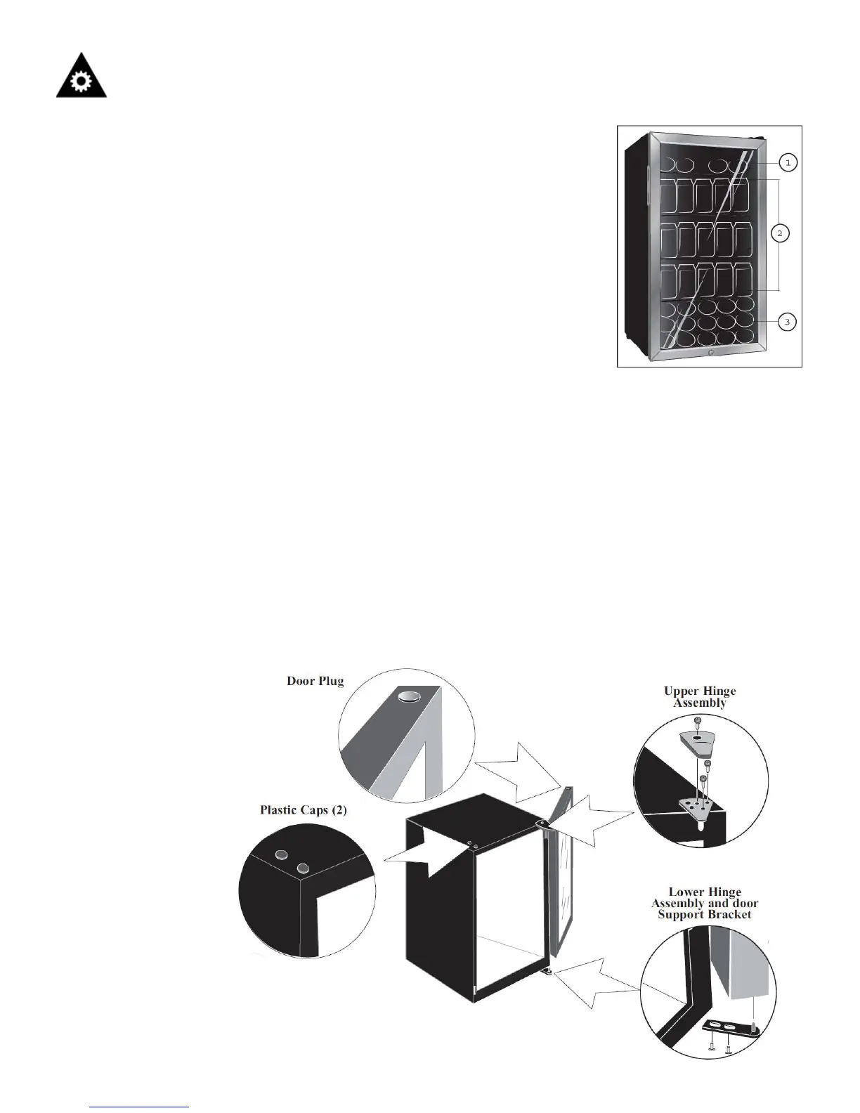 • Remove the two plastic caps from the cabinet and the door plug from the top of the door.